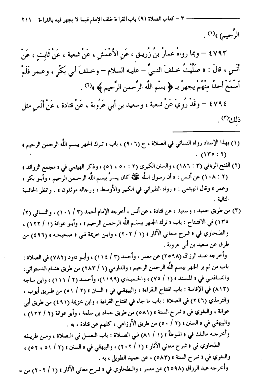 4793 - وَبِمَا رَوَاهُ عَمَّارُ بْنُ زُرَيْقٍ عَنِ الْأَعْمَشِ، عَنْ شُعْبَةَ، عَنْ ثَابِتٍ، عَنْ أَنَسٍ، قَالَ: " صَلَّيْتُ خَلْفَ النَّبِيِّ - عَلَيْهِ السَّلَامُ -، وَخَلْفَ أَبِي بَكْرٍ وَعُمَرَ، فَلَمْ أَسْمَعْ أَحَدًا مِنْهُمْ يَجْهَرُ بِ " بِسْمِ اللَّهِ الرَّحْمَنِ الرَّحِيمِ " ".