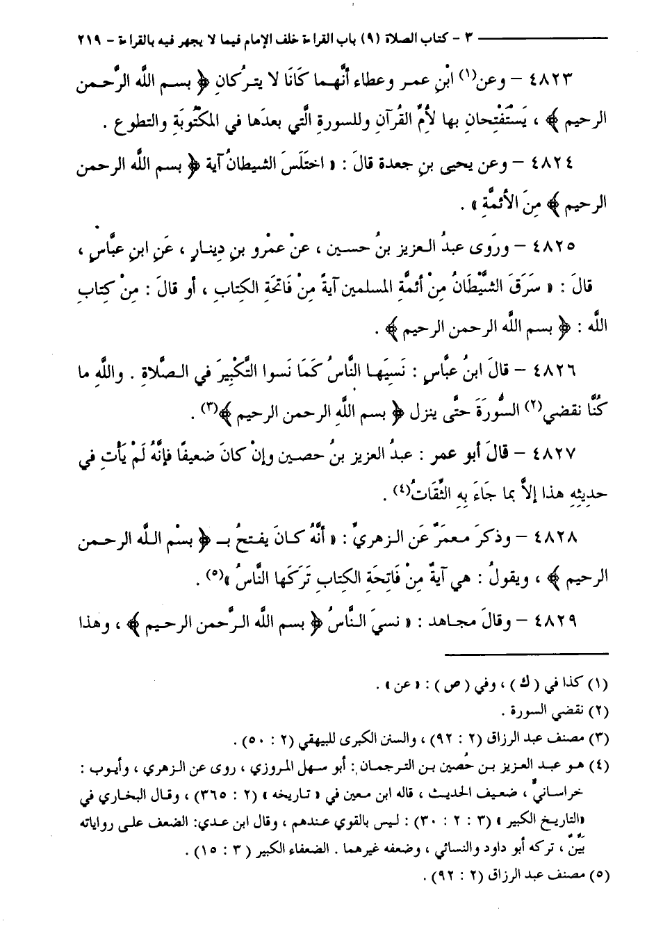 4825 - وَرَوَى عَبْدُ الْعَزِيزِ بْنُ حُسَيْنٍ عَنْ عَمْرِو بْنِ دِينَارٍ، عَنِ ابْنِ عَبَّاسٍ قَالَ: " سَرَقَ الشَّيْطَانُ مِنَ أَئِمَّةِ الْمُسْلِمِينَ آيَةً مِنْ فَاتِحَةِ الْكِتَابِ، أَوْ قَالَ: مِنْ كِتَابِ اللَّهِ " بِسْمِ اللَّهِ الرَّحْمَنِ الرَّحِيمِ ".