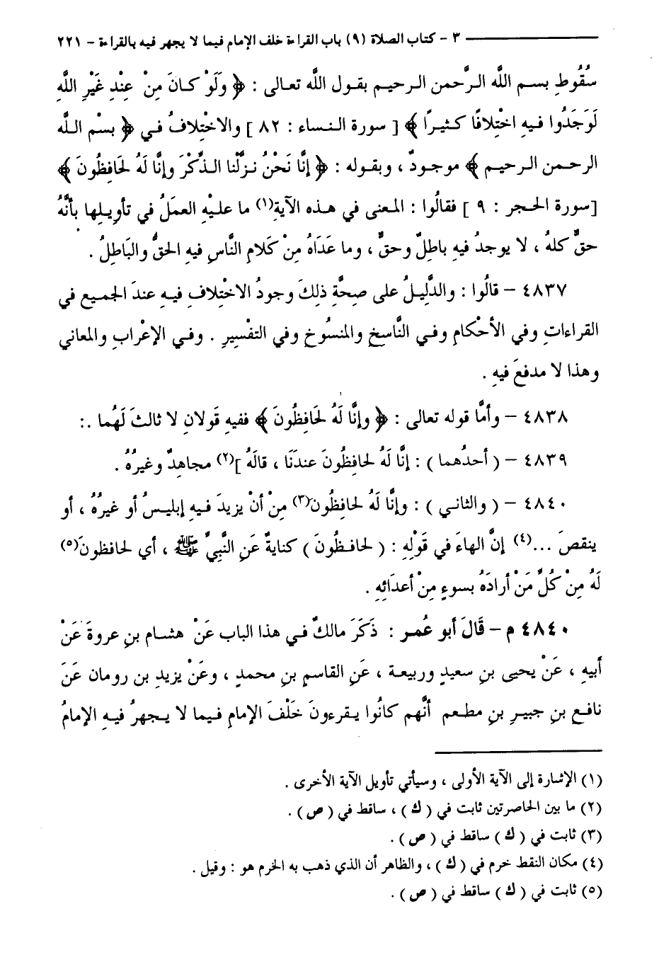 4840 م - قَالَ أَبُو عُمَرَ: ذَكَرَ مَالِكٌ فِي هَذَا الْبَابِ عَنْ هِشَامِ بْنِ عُرْوَةَ، عَنْ أَبِيهِ، عَنْ يَحْيَى بْنِ سَعِيدٍ وَرَبِيعَةَ عَنِ الْقَاسِمِ بْنِ مُحَمَّدٍ، وَعَنْ يَزِيدَ بْنِ رُومَانَ، عَنْ نَافِعِ بْنِ جُبَيْرِ بْنِ مُطْعِمٍ - أَنَّهُمْ كَانُوا يَقْرَءُونَ خَلْفَ الْإِمَامِ فِيمَا لَا يَجْهَرُ فِيهِ الْإِمَامُ