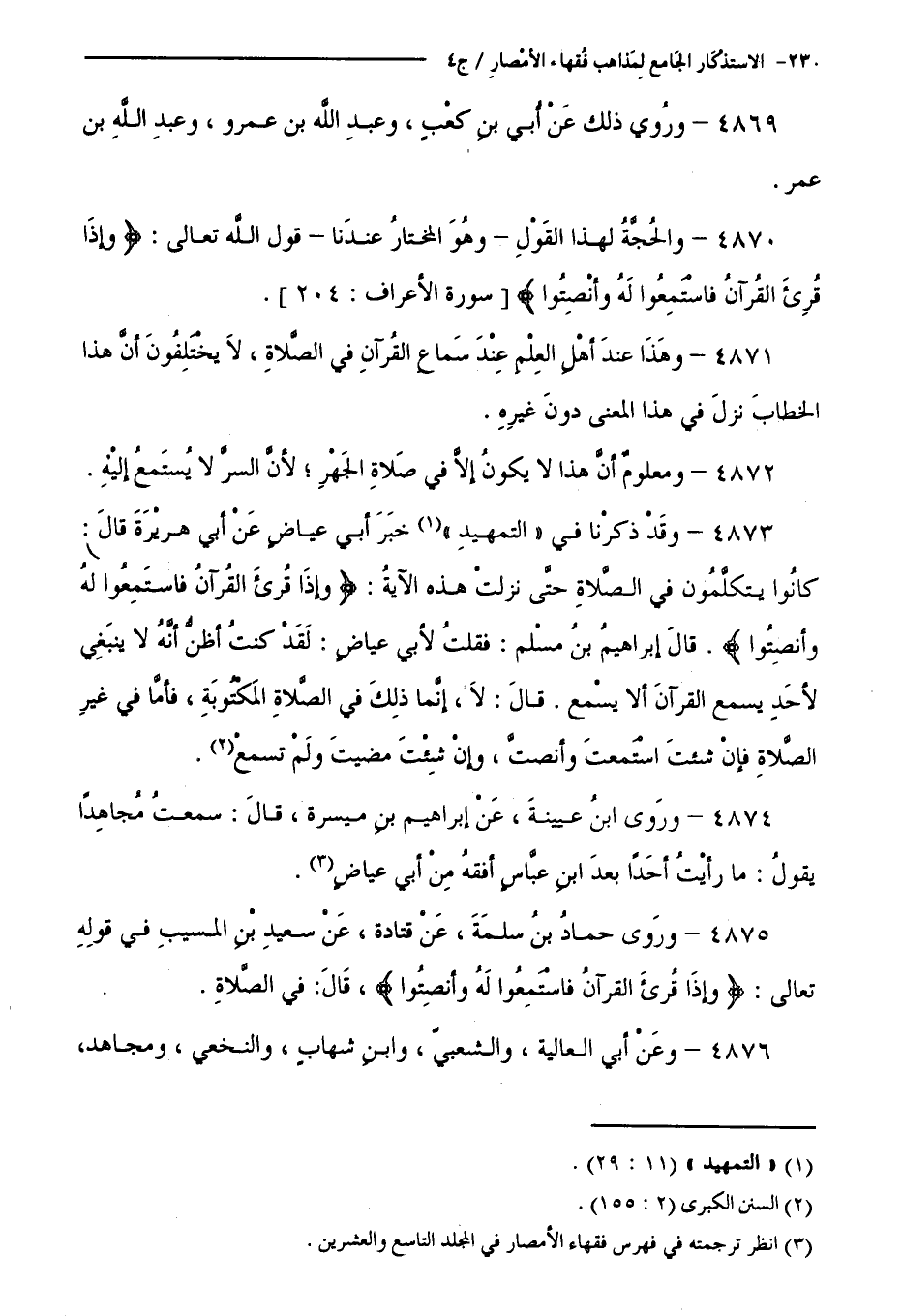 4871 - وَهَذَا عِنْدَ أَهْلِ الْعِلْمِ عِنْدَ سَمَاعِ الْقُرْآنِ فِي الصَّلَاةِ، لَا يَخْتَلِفُونَ أَنَّ هَذَا الْخِطَابَ نَزَلَ فِي هَذَا الْمَعْنَى دُونَ غَيْرِهِ.