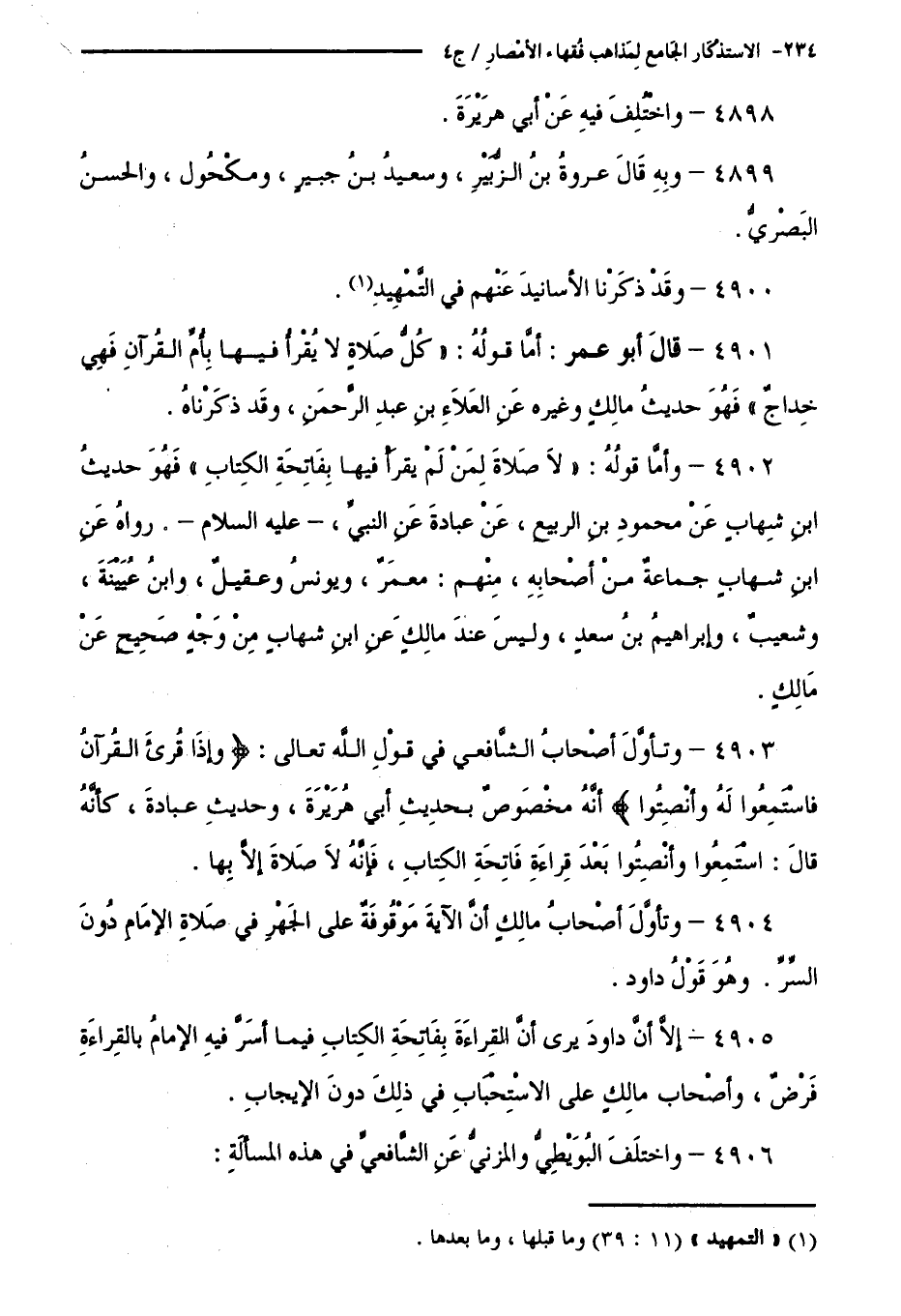 4905 - إِلَّا أَنَّ دَاوُدَ يَرَى أَنَّ الْقِرَاءَةَ بِفَاتِحَةِ الْكِتَابِ فِيمَا أَسَرَّ فِيهِ الْإِمَامُ بِالْقِرَاءَةِ فَرْضٌ، وَأَصْحَابُ مَالِكٍ عَلَى الِاسْتِحْبَابِ فِي ذَلِكَ دُونَ الْإِيجَابِ.