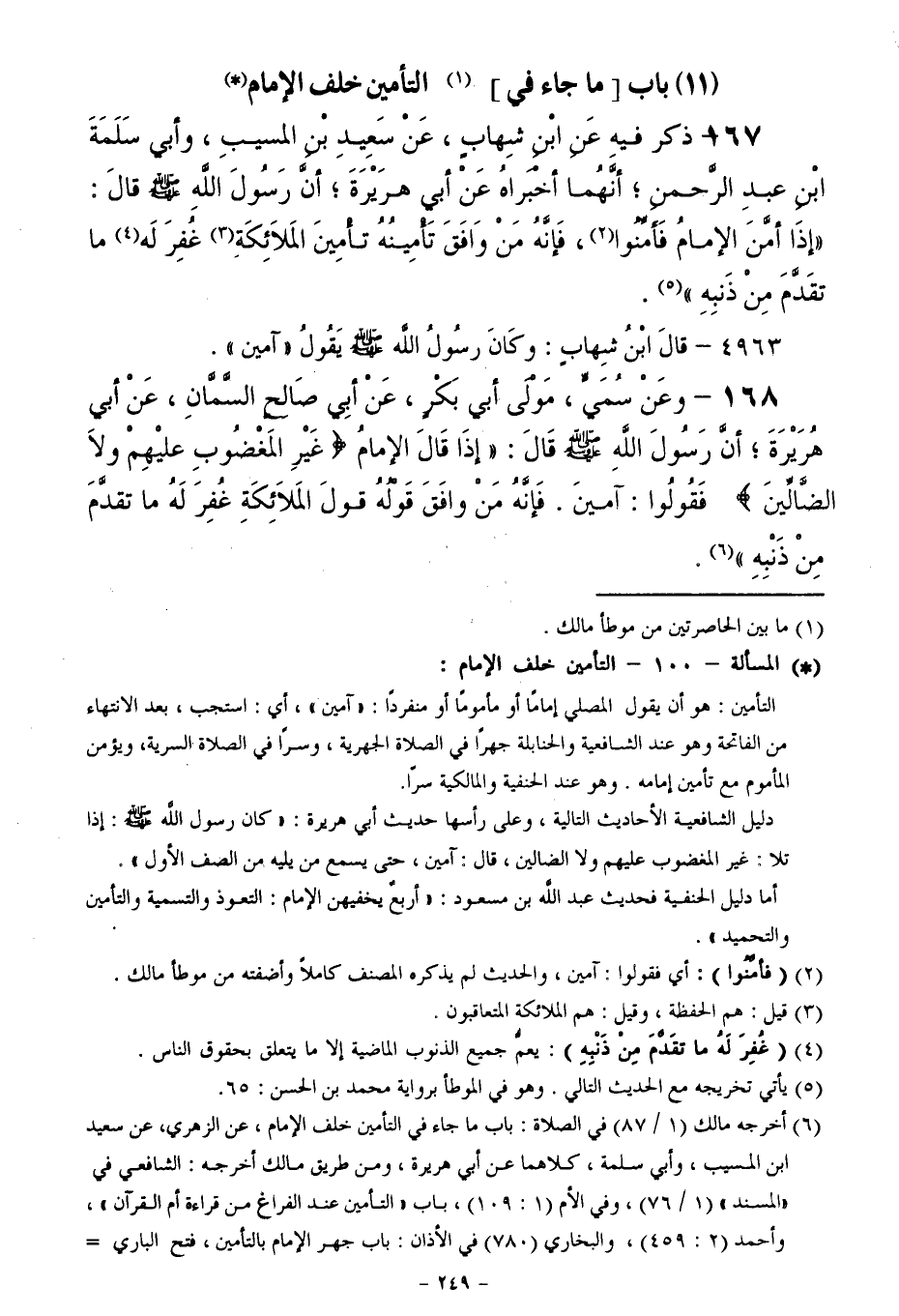 167 - ذَكَرَ فِيهِ عَنِ ابْنِ شِهَابٍ، عَنْ سَعِيدِ بْنِ الْمُسَيَّبِ وَأَبِي سَلَمَةَ بْنِ عَبْدِ الرَّحْمَنِ أَنَّهُمَا أَخْبَرَاهُ عَنْ أَبِي هُرَيْرَةَ أَنَّ رَسُولَ اللَّهِ - صَلَّى اللَّهُ عَلَيْهِ وَسَلَّمَ - قَالَ: "إِذَا أَمَّنَ الْإِمَامُ فَأَمِّنُوا ; فَإِنَّهُ مَنْ وَافَقَ تَأْمِينُهُ تَأْمِينَ الْمَلَائِكَةِ غُفِرَ لَهُ مَا تَقَدَّمَ مِنْ ذَنْبِهِ ".