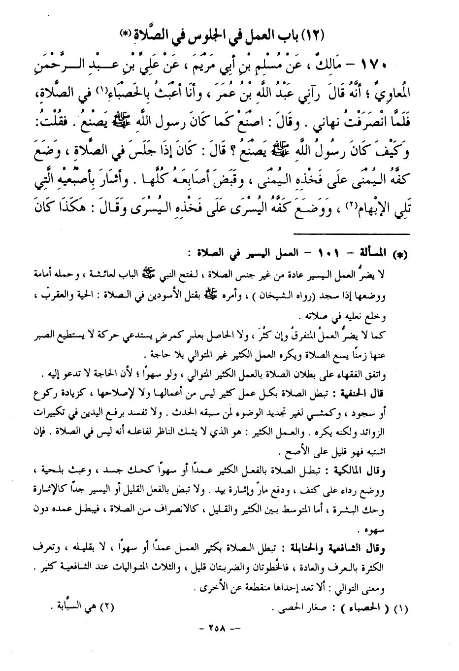170 - مَالِكٌ عَنْ مُسْلِمِ بْنِ أَبِي مَرْيَمَ، عَنْ عَلِيِّ بْنِ عَبْدِ الرَّحْمَنِ الْمُعَاوِيِّ أَنَّهُ قَالَ: رَآنِي عَبْدُ اللَّهِ بْنُ عُمَرَ وَأَنَا أَعْبَثُ بِالْحَصْبَاءِ فِي الصَّلَاةِ، فَلَمَّا انْصَرَفْتُ نَهَانِي، وَقَالَ: اصْنَعْ كَمَا كَانَ رَسُولُ اللَّهِ - صَلَّى اللَّهُ عَلَيْهِ وَسَلَّمَ - يَصْنَعُ، فَقُلْتُ: وَكَيْفَ كَانَ رَسُولُ اللَّهِ - صَلَّى اللَّهُ عَلَيْهِ وَسَلَّمَ - يَصْنَعُ ؟ قَالَ:كَانَ إِذَا جَلَسَ فِي الصَّلَاةِ وَضَعَ كَفَّهُ الْيُمْنَى عَلَى فَخْذِهِ الْيُمْنَى، وَقَبَضَ أَصَابِعَهُ كُلَّهَا، وَأَشَارَ بِأُصْبُعِهِ الَّتِي تَلِي الْإِبْهَامَ، وَوَضَعَ كَفَّهُ الْيُسْرَى عَلَى فَخْذِهِ الْيُسْرَى، وَقَالَ: هَكَذَا كَانَ