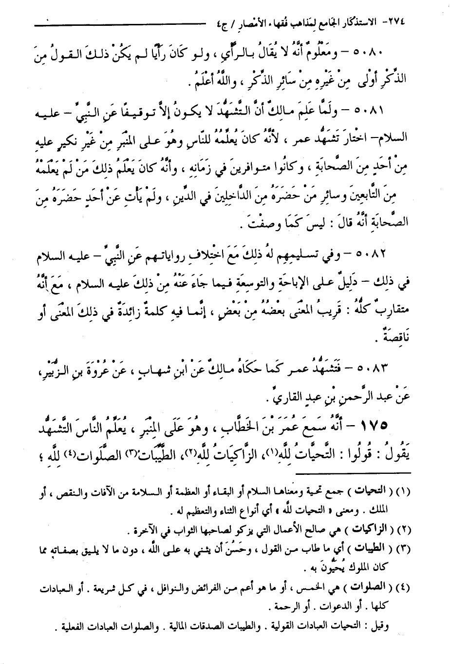 5081 - وَلَمَّا عَلِمَ مَالِكٌ أَنَّ التَّشَهُّدَ لَا يَكُونُ إِلَّا تَوْقِيفًا عَنِ النَّبِيِّ - عَلَيْهِ السَّلَامُ - اخْتَارَ تَشَهُّدَ عُمَرَ ; لِأَنَّهُ كَانَ يُعَلِّمُهُ لِلنَّاسِ وَهُوَ عَلَى الْمِنْبَرِ مِنَ غَيْرِ نَكِيرٍ عَلَيْهِ مِنْ أَحَدٍ مِنَ الصَّحَابَةِ، وَكَانُوا مُتَوَافِرِينَ فِي زَمَانِهِ، وَأَنَّهُ كَانَ يَعْلَمُ ذَلِكَ مَنْ لَمْ يَعْلَمْهُ مِنَ التَّابِعِينَ وَسَائِرِ مَنْ حَضَرَهُ مِنَ الدَّاخِلِينَ فِي الدِّينِ، وَلَمْ يَأْتِ عَنْ أَحَدٍ حَضَرَهُ مِنَ الصَّحَابَةِ أَنَّهُ قَالَ: لَيْسَ كَمَا وَصَفْتَ.