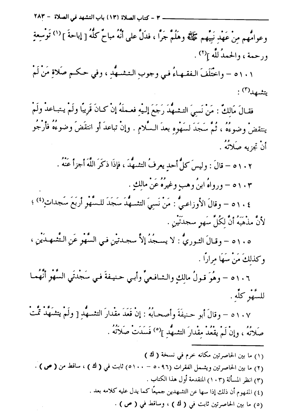 5101 - وَاخْتَلَفَ الْفُقَهَاءُ فِي وُجُوبِ التَّشَهُّدِ، وَفِي حُكْمِ صَلَاةِ مَنْ لَمْ يَتَشَهَّدْ ; فَقَالَ مَالِكٌ: مَنْ نَسِيَ التَّشَهُّدَ رَجَعَ إِلَيْهِ فَعَمِلَهُ إِنْ كَانَ قَرِيبًا وَلَمْ يَتَبَاعَدْ وَلَمْ يَنْتَقِضْ وُضُوءُهُ، ثُمَّ سَجَدَ لِسَهْوِهِ بَعْدَ السَّلَامِ. وَإِنْ تَبَاعَدَ أَوِ انْتَقَضَ وُضُوءُهُ فَأَرْجُو أَنْ تُجْزِيَهُ صَلَاتُهُ.