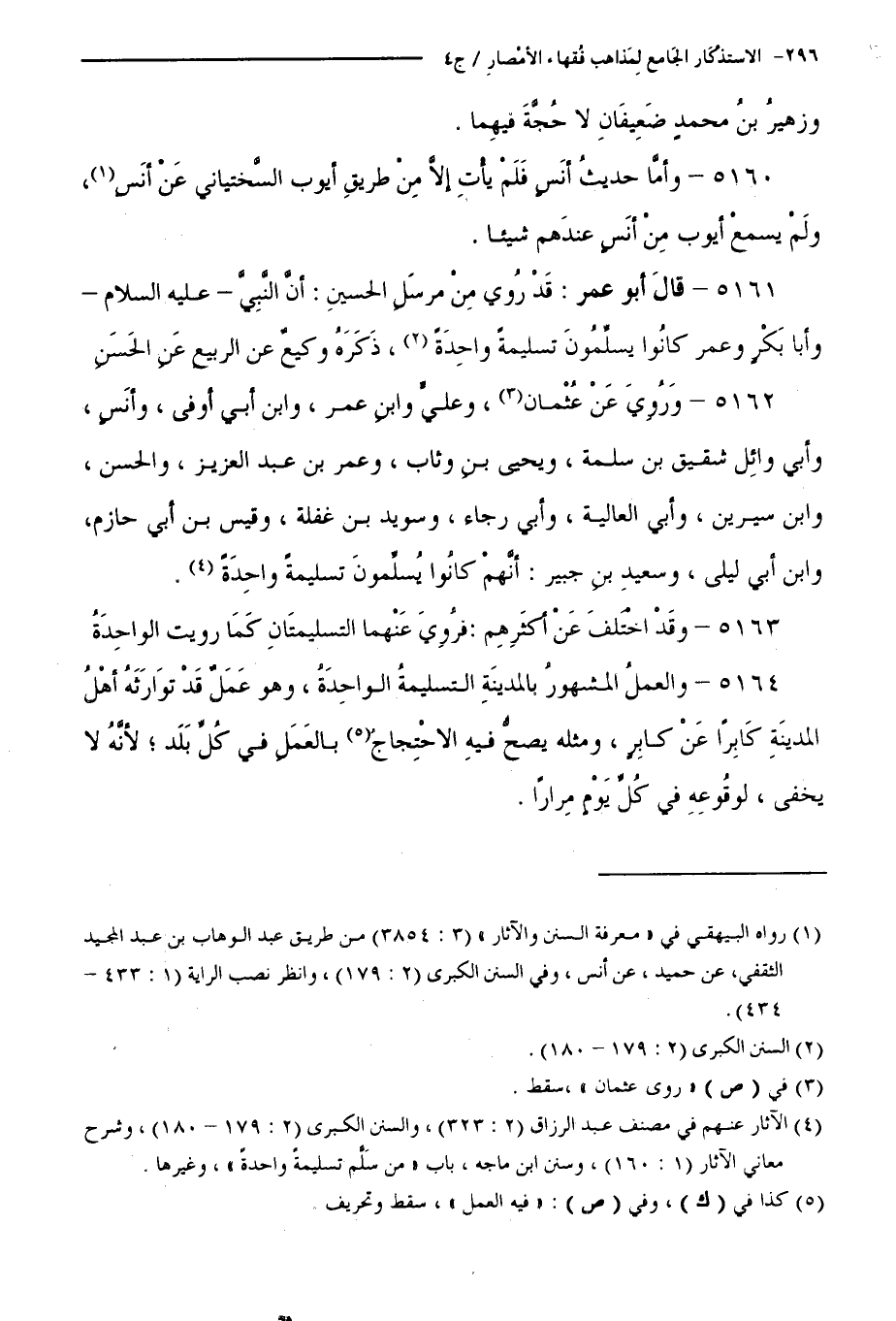5162 - وَرُوِيَ عَنْ عُثْمَانَ، وَعَلَيٍّ، وَابْنِ عُمَرَ، وَابْنِ أَبِي أَوْفَى، وَأَنَسٍ، وَأَبِي وَائِلٍ شَقِيقِ بْنِ سَلَمَةَ، وَيَحْيَى بْنِ وَثَّابٍ، وَعُمَرَ بْنِ عَبْدِ الْعَزِيزِ، وَالْحَسَنِ، وَابْنِ سِيرِينَ، وَأَبِي الْعَالِيَةِ، وَأَبِي رَجَاءٍ، وَسُوَيْدِ بْنِ غَفَلَةَ، وَقَيْسِ بْنِ أَبِي حَازِمٍ، وَابْنِ أَبِي لَيْلَى، وَسَعِيدِ بْنِ جُبَيْرٍ - أَنَّهُمْ كَانُوا يُسَلِّمُونَ تَسْلِيمَةً وَاحِدَةً.
