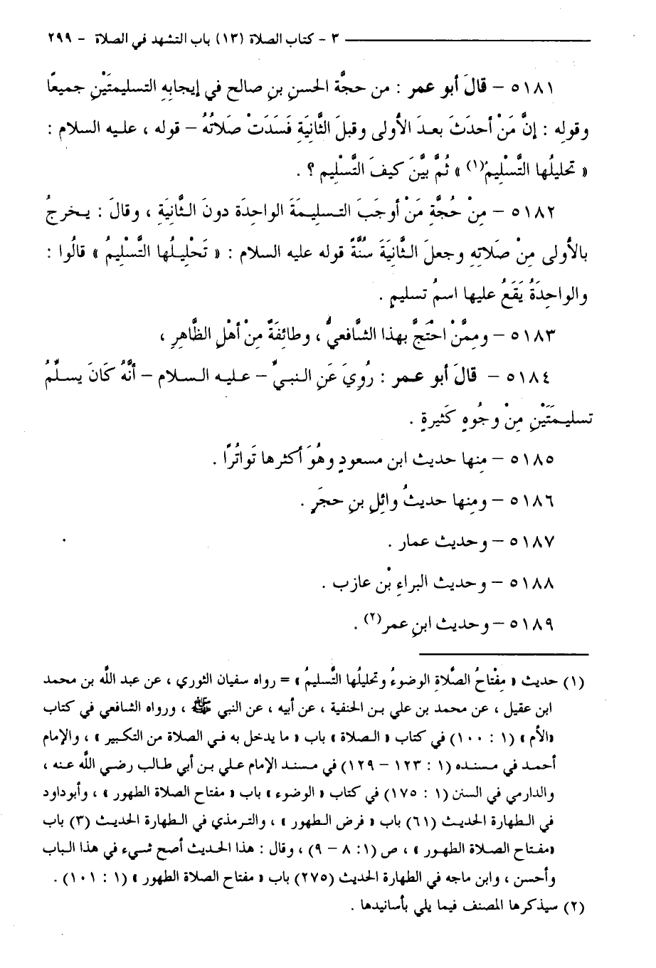 5181 - قَالَ أَبُو عُمَرَ: مِنْ حُجَّةِ الْحَسَنِ بْنِ صَالِحِ فِي إِيجَابِهِ التَّسْلِيمَتَيْنِ جَمِيعًا وَقَوْلِهِ: إِنَّ مَنْ أَحْدَثَ بَعْدَ الْأُولَى وَقَبْلَ الثَّانِيَةِ فَسَدَتْ صَلَاتُهُ - قَوْلُهُ - عَلَيْهِ السَّلَامُ -: " تَحْلِيلُهَا التَّسْلِيمُ "، ثُمَّ بَيَّنَ كَيْفَ التَّسْلِيمُ.