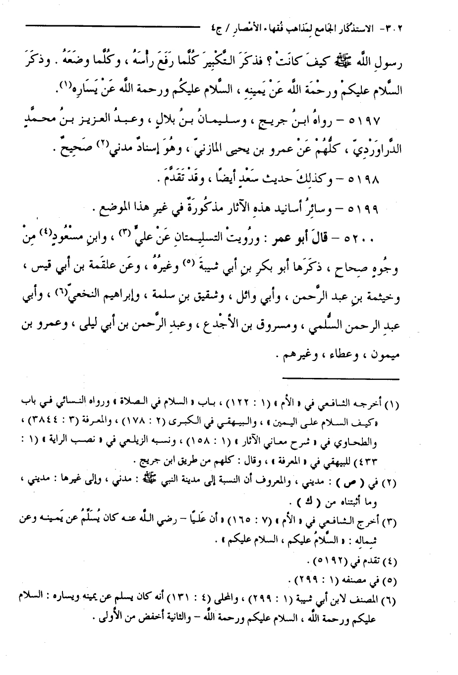5200 - قَالَ أَبُو عُمَرَ: وَرُوِيَتِ التَّسْلِيمَتَانِ عَنْ عَلِيٍّ وَابْنِ مَسْعُودٍ مِنْ وُجُوهٍ صِحَاحٍ، ذَكَرَهَا أَبُو بَكْرِ بْنُ أَبِي شَيْبَةَ وَغَيْرُهُ، وَعَنْ عَلْقَمَةَ بْنِ أَبِي قَيْسٍ، وَخْيَثَمَةَ بْنِ عَبْدِ الرَّحْمَنِ، وَأَبَى وَائِلٍ، وَشَقِيقِ بْنِ سَلَمَةَ، وَإِبْرَاهِيمَ النَّخَعِيِّ، وَأَبِي عَبْدِ الرَّحْمَنِ السُّلَمِيِّ، وَمَسْرُوقِ بْنِ الْأَجْدَعِ، وَعَبْدِ الرَّحْمَنِ بْنِ أَبِي لَيْلَى، وَعَمْرِو بْنِ مَيْمُونٍ، وَعَطَاءٍ، وَغَيْرِهِمْ.