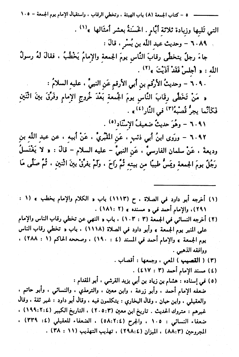 6090 - وَحَدِيثُ الْأَرْقَمِ بْنِ أَبِي الْأَرْقَمِ عَنِ النَّبِيِّ - عَلَيْهِ السَّلَامُ -: "مَنْ تَخَطَّى رِقَابَ النَّاسِ يَوْمَ الْجُمُعَةِ بَعْدَ خُرُوجِ الْإِمَامِ وَفَرَّقَ بَيْنَ اثْنَيْنِ، فَكَأَنَّمَا يَجُرُّ قُصْبَهُ فِي النَّارِ ".