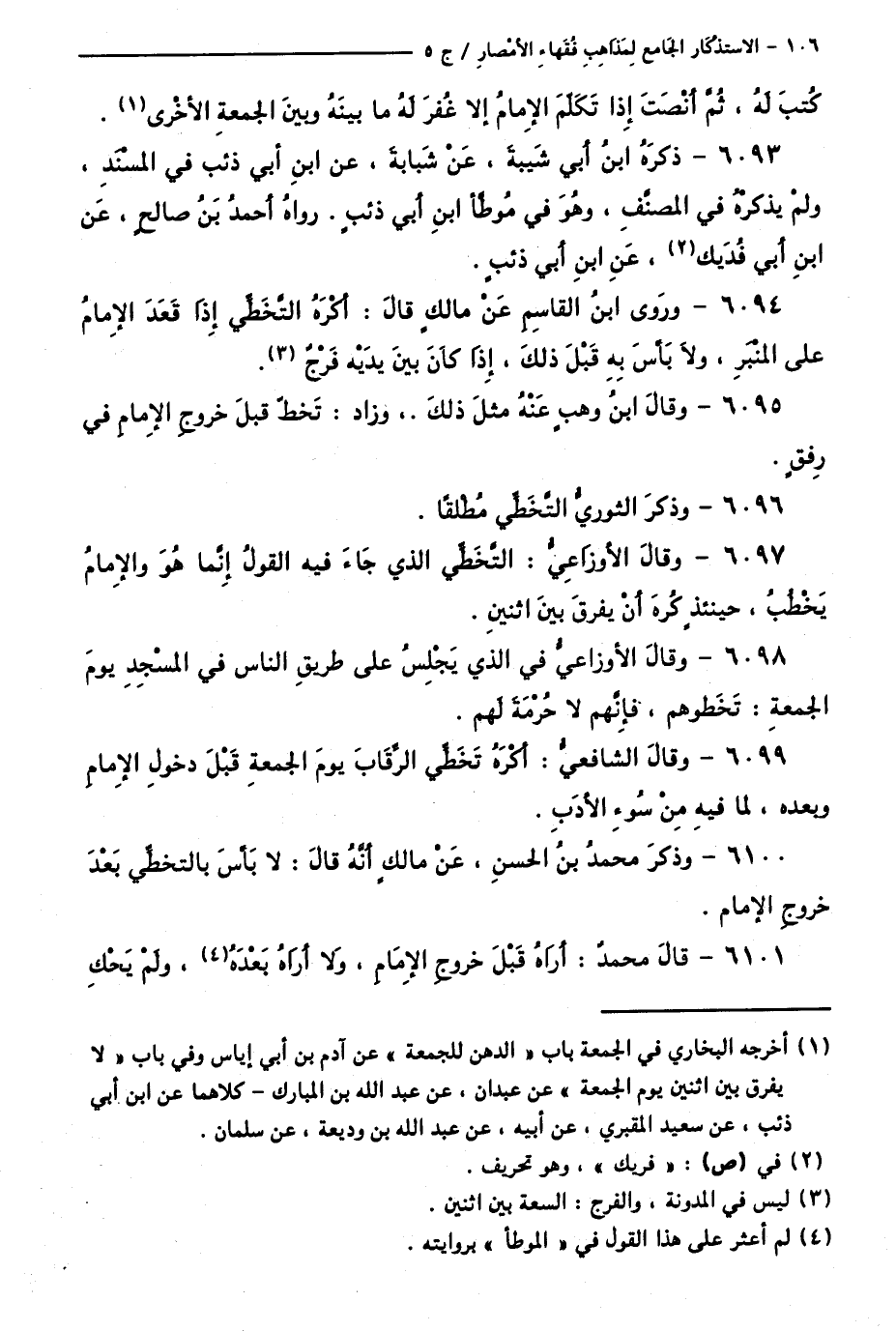6095 - وَقَالَ ابْنُ وَهْبٍ عَنْهُ مِثْلَ ذَلِكَ، وَزَادَ: تَخَطَّ قَبْلَ خُرُوجِ الْإِمَامِ فِي رِفْقٍ.
