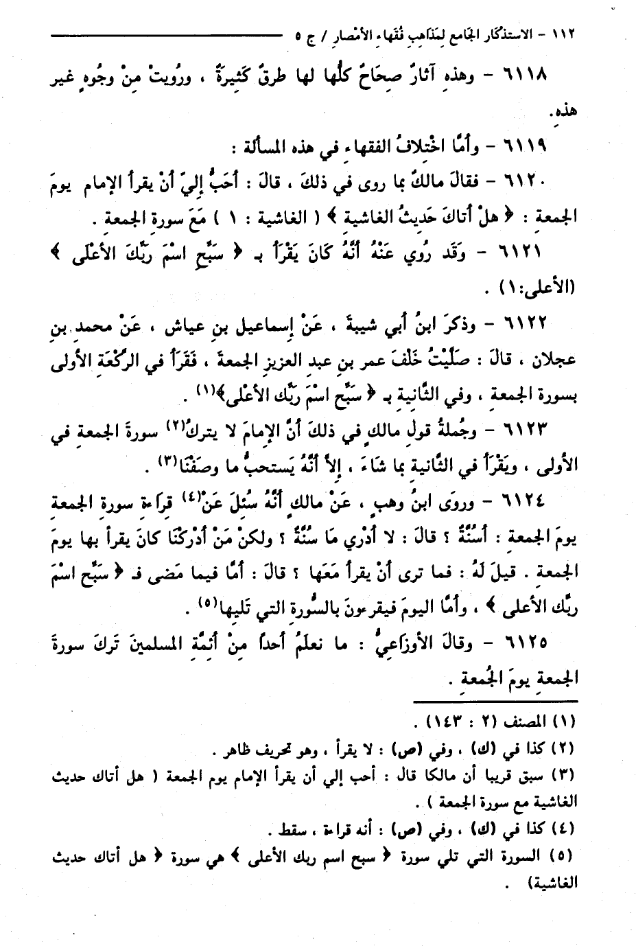 6125 - وَقَالَ الْأَوْزَاعِيُّ: مَا نَعْلَمُ أَحَدًا مِنْ أَئِمَّةِ الْمُسْلِمِينَ تَرَكَ سُورَةَ الْجُمُعَةِ يَوْمَ الْجُمُعَةِ.