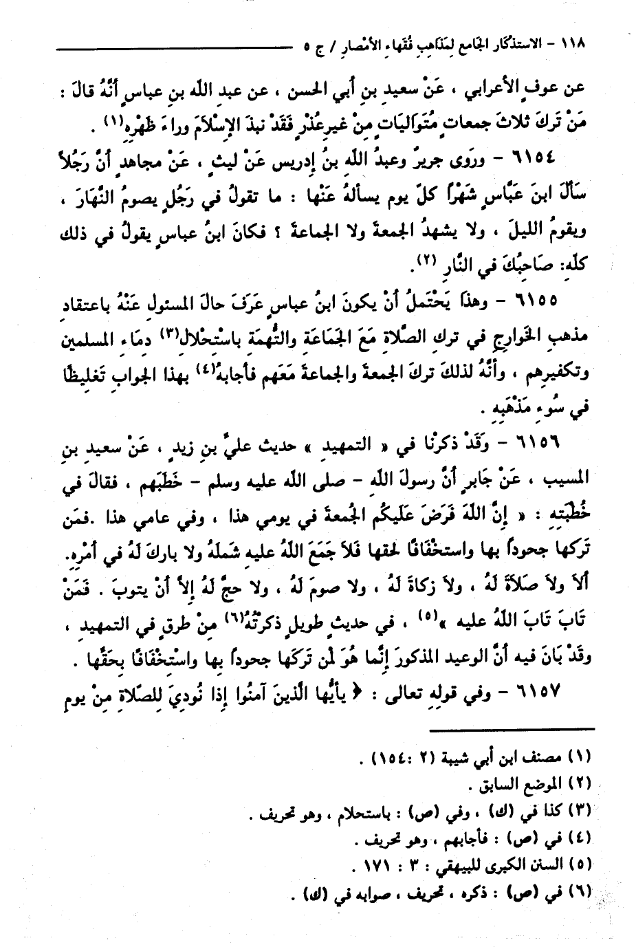 6156 - وَقَدْ ذَكَرْنَا فِي " التَّمْهِيدِ " حَدِيثَ عَلِيِّ بْنِ زَيْدٍ، عَنْ سَعِيدِ بْنِ الْمُسَيَّبِ، عَنْ جَابِرٍ أَنَّ رَسُولَ اللَّهِ - صَلَّى اللَّهُ عَلَيْهِ وَسَلَّمَ - خَطَبَهُمْ فَقَالَ فِي خُطْبَتِهِ: "إِنَّ اللَّهَ فَرَضَ عَلَيْكُمُ الْجُمُعَةَ فِي يَوْمِي هَذَا وَفِي عَامِي هَذَا، فَمَنْ تَرَكَهَا - جُحُودًا بِهَا وَاسْتِخْفَافًا لِحَقِّهَا - فَلَا جَمَعَ اللَّهُ عَلَيْهِ شَمْلَهُ، وَلَا بَارَكَ لَهُ فِي أَمْرِهِ. أَلَا وَلَا صَلَاةَ لَهُ، وَلَا زَكَاةَ لَهُ، وَلَا صَوْمَ لَهُ، وَلَا حَجَّ لَهُ إِلَّا أَنْ يَتُوبَ. فَمَنْ تَابَ تَابَ اللَّهُ عَلَيْهِ " فِي حَدِيثٍ طَوِيلٍ ذَكَرْتُهُ مِنْ طُرُقٍ فِي " التَّمْهِيدِ " وَقَدْ بَانَ فِيهِ أَنَّ الْوَعِيدَ الْمَذْكُورَ إِنَّمَا هُوَ لِمَنْ تَرَكَهَا جُحُودًا بِهَا وَاسْتِخْفَافًا بِحَقِّهَا.