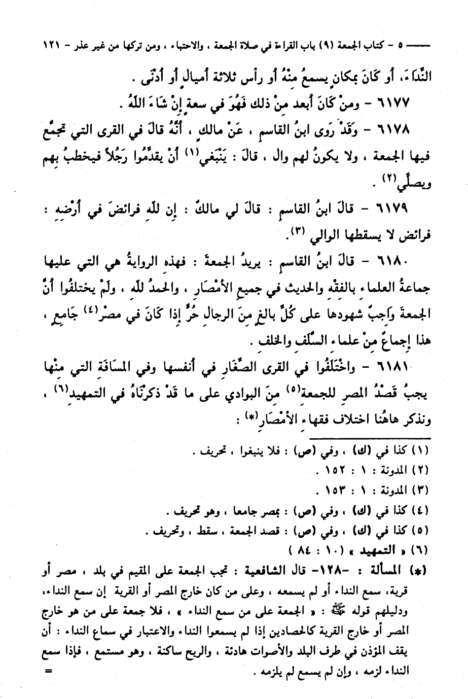 6180 - قَالَ ابْنُ الْقَاسِمِ: يُرِيدُ الْجُمُعَةَ: فَهَذِهِ الرِّوَايَةُ هِيَ الَّتِي عَلَيْهَا جَمَاعَةُ الْعُلَمَاءِ بِالْفِقْهِ وَالْحَدِيثِ فِي جَمِيعِ الْأَمْصَارِ، وَالْحَمْدُ لِلَّهِ، وَلَمْ يَخْتَلِفُوا أَنَّ الْجُمُعَةَ وَاجِبٌ شُهُودُهَا عَلَى كُلِّ بَالِغٍ مِنَ الرِّجَالِ حُرٍّ، إِذَا كَانَ فِي مِصْرٍ جَامِعٍ، هَذَا إِجْمَاعٌ مِنْ عُلَمَاءِ السَّلَفِ وَالْخَلَفِ.