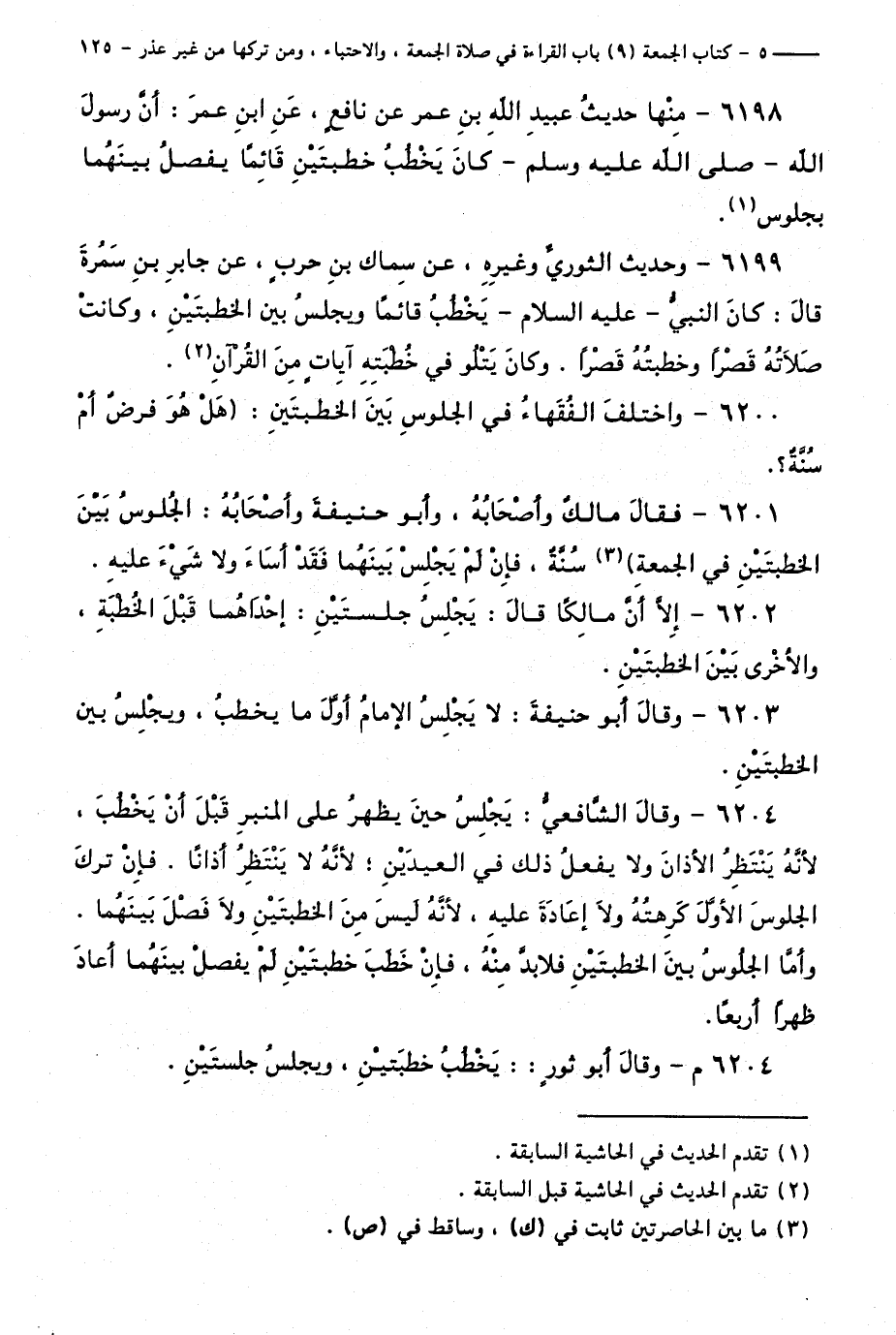 6201 - فَقَالَ مَالِكٌ وَأَصْحَابُهُ، وَأَبُو حَنِيفَةَ وَأَصْحَابُهُ: الْجُلُوسُ بَيْنَ الْخُطْبَتَيْنِ فِي الْجُمُعَةِ سُنَّةٌ، فَإِنْ لَمْ يَجْلِسْ بَيْنَهُمَا فَقَدْ أَسَاءَ وَلَا شَيْءَ عَلَيْهِ.