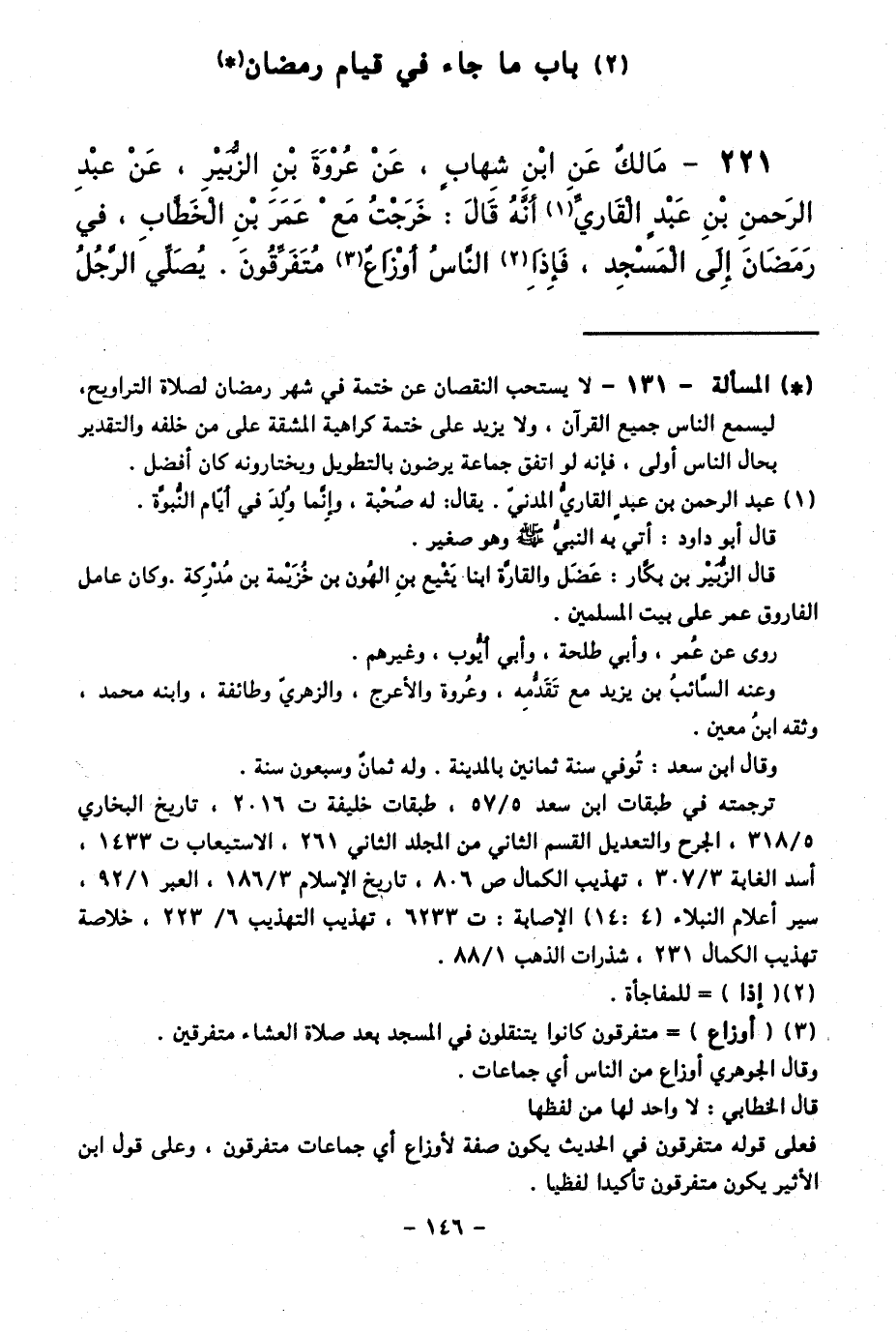 221 - مَالِكٌ، عَنِ ابْنِ شِهَابٍ، عَنْ عُرْوَةَ بْنِ الزُّبَيْرِ، عَنْ عَبْدِ الرَّحْمَنِ بْنِ عَبْدٍ الْقَارِيِّ أَنَّهُ قَالَ: خَرَجْتُ مَعَ عُمَرَ بْنِ الْخَطَّابِ فِي رَمَضَانَ إِلَى الْمَسْجِدِ، فَإِذَا النَّاسُ أَوْزَاعٌ مُتَفَرِّقُونَ ; يُصَلِّي الرَّجُلُ