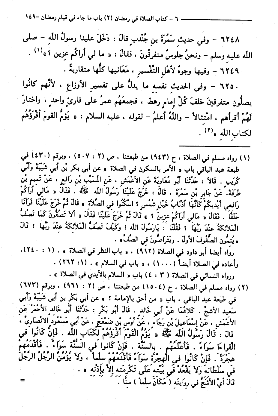 6250 - وَفِي الْحَدِيثِ نَفْسِهِ مَا يَدُلُّ عَلَى تَفْسِيرِ الْأَوْزَاعِ ; لِأَنَّهُمْ كَانُوا يُصَلُّونَ مُتَفَرِّقِينَ خَلْفَ كُلِّ إِمَامٍ رَهْطٌ، فَجَمَعَهُمْ عُمَرُ عَلَى قَارِئٍ وَاحِدٍ، وَاخْتَارَ لَهُمْ أَقْرَأَهُمُ، امْتِثَالًا - وَاللَّهُ أَعْلَمُ - لِقَوْلِهِ، عَلَيْهِ السَّلَامُ: "يَؤُمُّ الْقَوْمَ أَقْرَؤُهُمْ لِكِتَابِ اللَّهِ ".