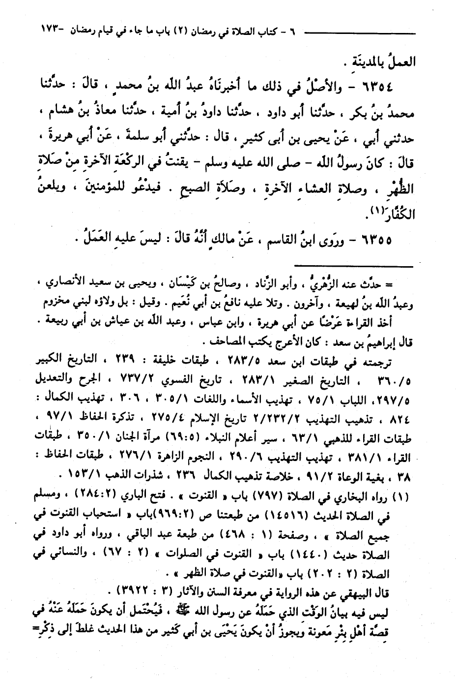 6354 - وَالْأَصْلُ فِي ذَلِكَ مَا أَخْبَرَنَاهُ عَبْدُ اللَّهِ بْنُ مُحَمَّدٍ، قَالَ: حَدَّثَنَا مُحَمَّدُ بْنُ بَكْرٍ، حَدَّثَنَا أَبُو دَاوُدَ، حَدَّثَنَا دَاوُدُ بْنُ أُمَيَّةَ، حَدَّثَنَا مُعَاذُ بْنُ هِشَامٍ، حَدَّثَنِي أَبِي، عَنْ يَحْيَى بْنِ أَبِي كَثِيرٍ، قَالَ: حَدَّثَنِي أَبُو سَلَمَةَ عَنْ أَبِي هُرَيْرَةَ، قَالَ:كَانَ رَسُولُ اللَّهِ - صَلَّى اللَّهُ عَلَيْهِ وَسَلَّمَ - يَقْنُتُ فِي الرَّكْعَةِ الْآخِرَةِ مِنْ صَلَاةِ الظُّهْرِ، وَصَلَاةِ الْعِشَاءِ الْآخِرَةِ، وَصَلَاةِ الصُّبْحِ، فَيَدْعُو لِلْمُؤْمِنِينَ وَيَلْعَنُ الْكُفَّارَ.