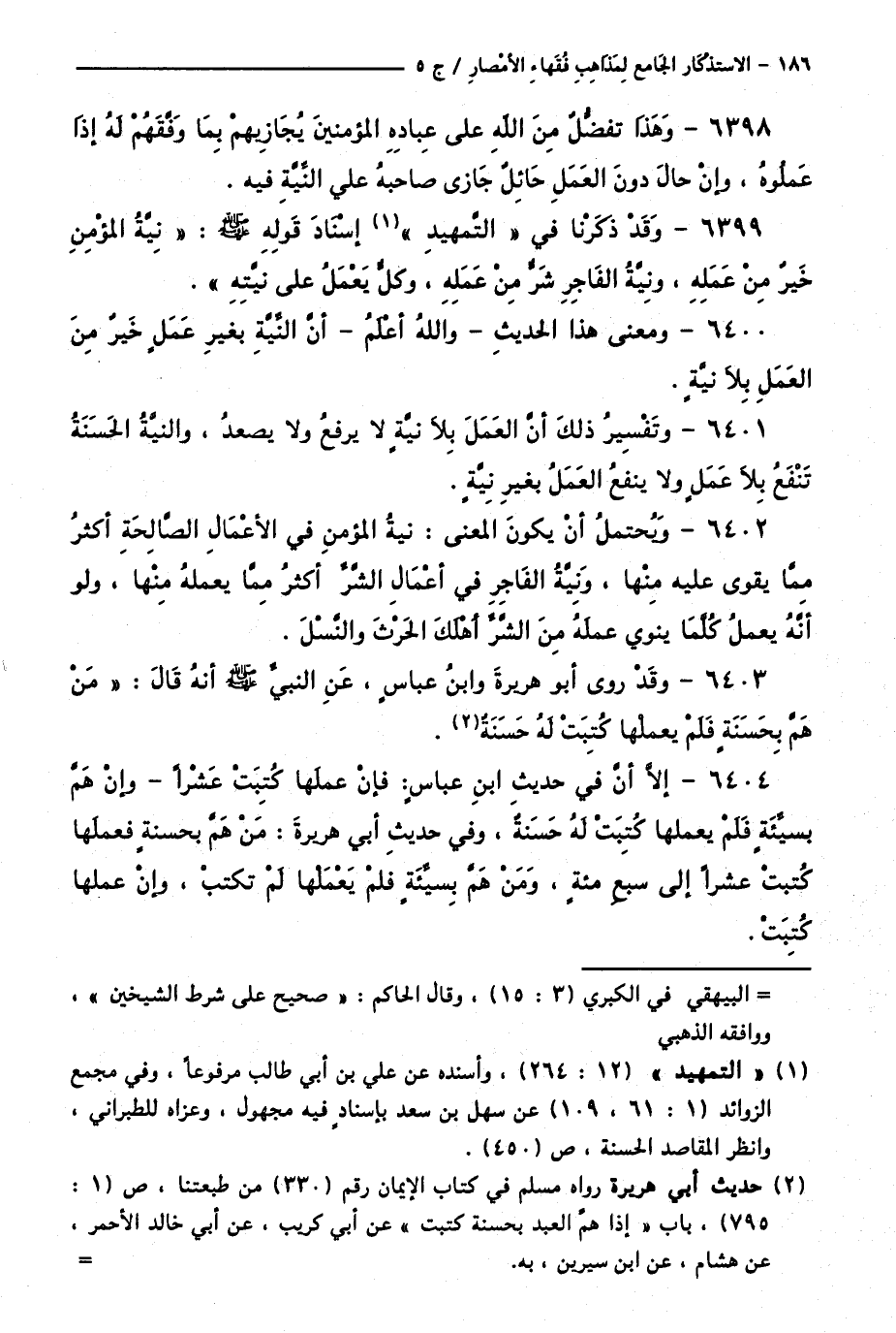 6399 - وَقَدْ ذَكَرْنَا فِي " التَّمْهِيدِ " إِسْنَادَ قَوْلِهِ - صَلَّى اللَّهُ عَلَيْهِ وَسَلَّمَ -:نِيَّةُ الْمُؤْمِنِ خَيْرٌ مِنْ عَمَلِهِ، وَنِيَّةُ الْفَاجِرِ شَرٌّ مِنْ عَمَلِهِ، وَكُلٌّ يَعْمَلُ عَلَى نِيَّتِهِ ".