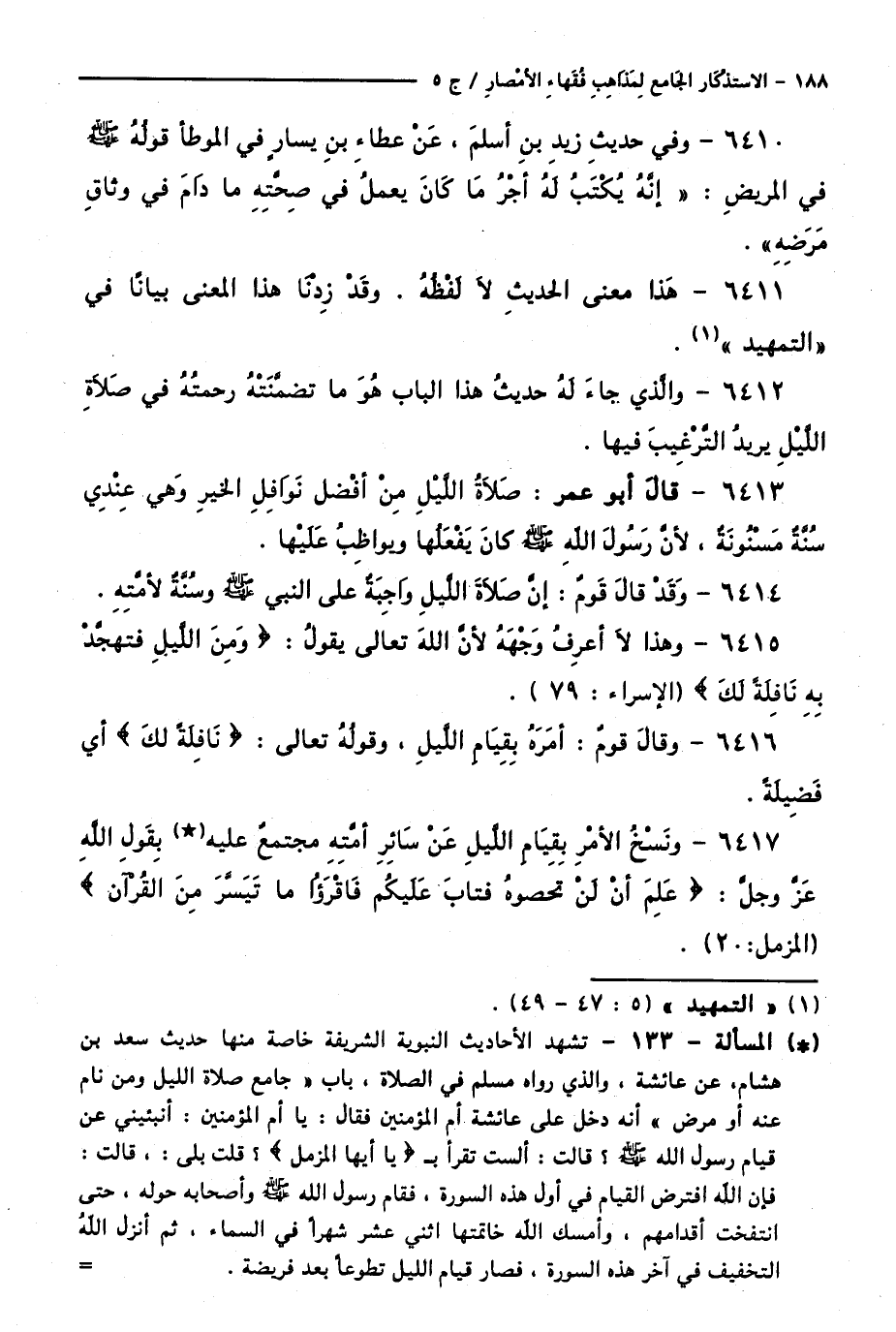 6413 - قَالَ أَبُو عُمَرَ: صَلَاةُ اللَّيْلِ مِنْ أَفْضَلِ نَوَافِلِ الْخَيْرِ وَهِيَ عِنْدِي سُنَّةٌ مَسْنُونَةٌ، لِأَنَّ رَسُولَ اللَّهِ - صَلَّى اللَّهُ عَلَيْهِ وَسَلَّمَ - كَانَ يَفْعَلُهَا وَيُوَاظِبُ عَلَيْهَا.
