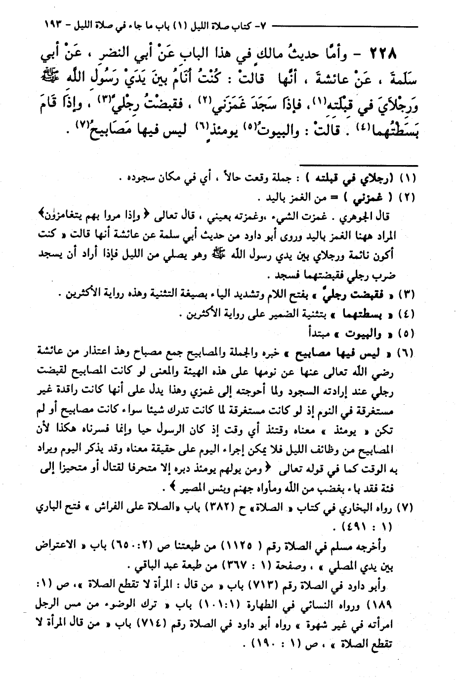228 - وَأَمَّا حَدِيثُ مَالِكٍ فِي هَذَا الْبَابِ عَنْ أَبِي النَّضْرِ، عَنْ أَبِي سَلَمَةَ، عَنْ عَائِشَةَ أَنَّهَا قَالَتْ:كُنْتُ أَنَامُ بَيْنَ يَدَيْ رَسُولِ اللَّهِ - صَلَّى اللَّهُ عَلَيْهِ وَسَلَّمَ - وَرِجْلَايَ فِي قِبْلَتِهِ، فَإِذَا سَجَدَ غَمَزَنِي فَقَبَضْتُ رِجْلَيَّ، وَإِذَا قَامَ بَسَطْتُهُمَا. قَالَتْ: وَالْبُيُوتُ يَوْمَئِذٍ لَيْسَ فِيهَا مَصَابِيحُ.