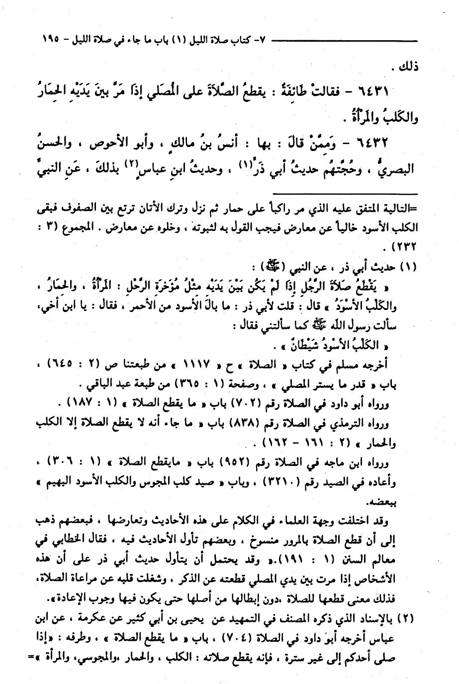 6431 - فَقَالَتْ طَائِفَةٌ: يَقْطَعُ الصَّلَاةَ عَلَى الْمُصَلِّي إِذَا مَرَّ بَيْنَ يَدَيْهِ الْحِمَارُ وَالْكَلْبُ وَالْمَرْأَةُ.