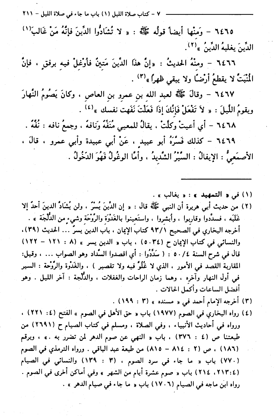 6465 - وَمِنْهَا أَيْضًا قَوْلُهُ: " لَا تَشَادُّوا الدِّينَ فَإِنَّهُ مَنْ غَالَبَ الدِّينَ يَغْلِبُهُ الدِّينُ ".