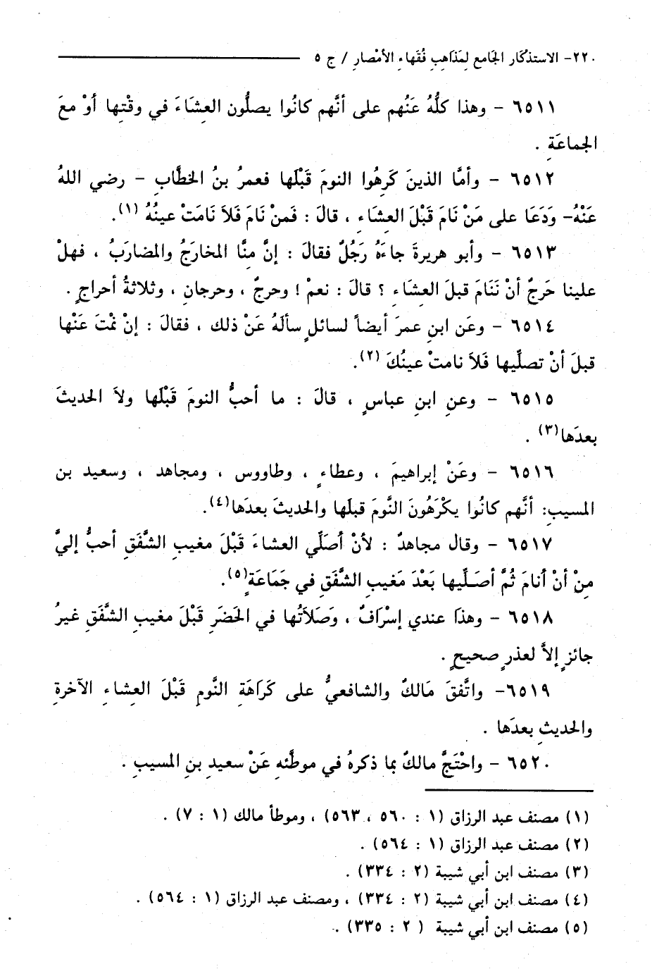 6511 - وَهَذَا كُلُّهُ عَنْهُمْ عَلَى أَنَّهُمْ كَانُوا يُصَلُّونَ الْعِشَاءَ فِي وَقْتِهَا أَوْ مَعَ الْجَمَاعَةِ.