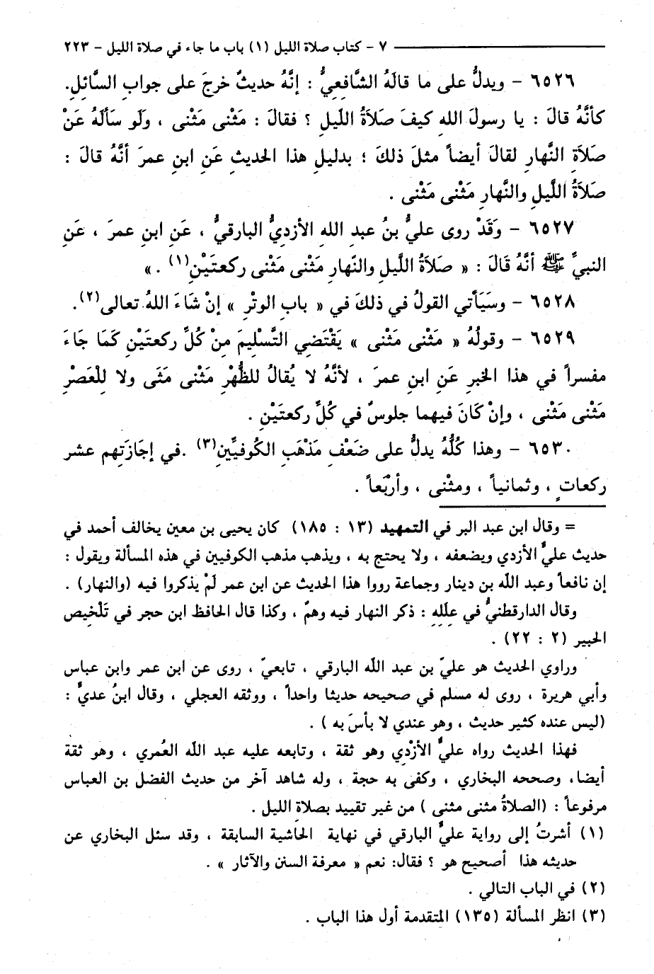 6527 - وَقَدْ رَوَى عَلِيُّ بْنُ عَبْدِ اللَّهِ الْأَزْدِيُّ الْبَارِقِيُّ عَنِ ابْنِ عُمَرَ، عَنِ النَّبِيِّ أَنَّهُ قَالَ: " صَلَاةُ اللَّيْلِ وَالنَّهَارِ مَثْنَى مَثْنَى رَكْعَتَيْنِ ".