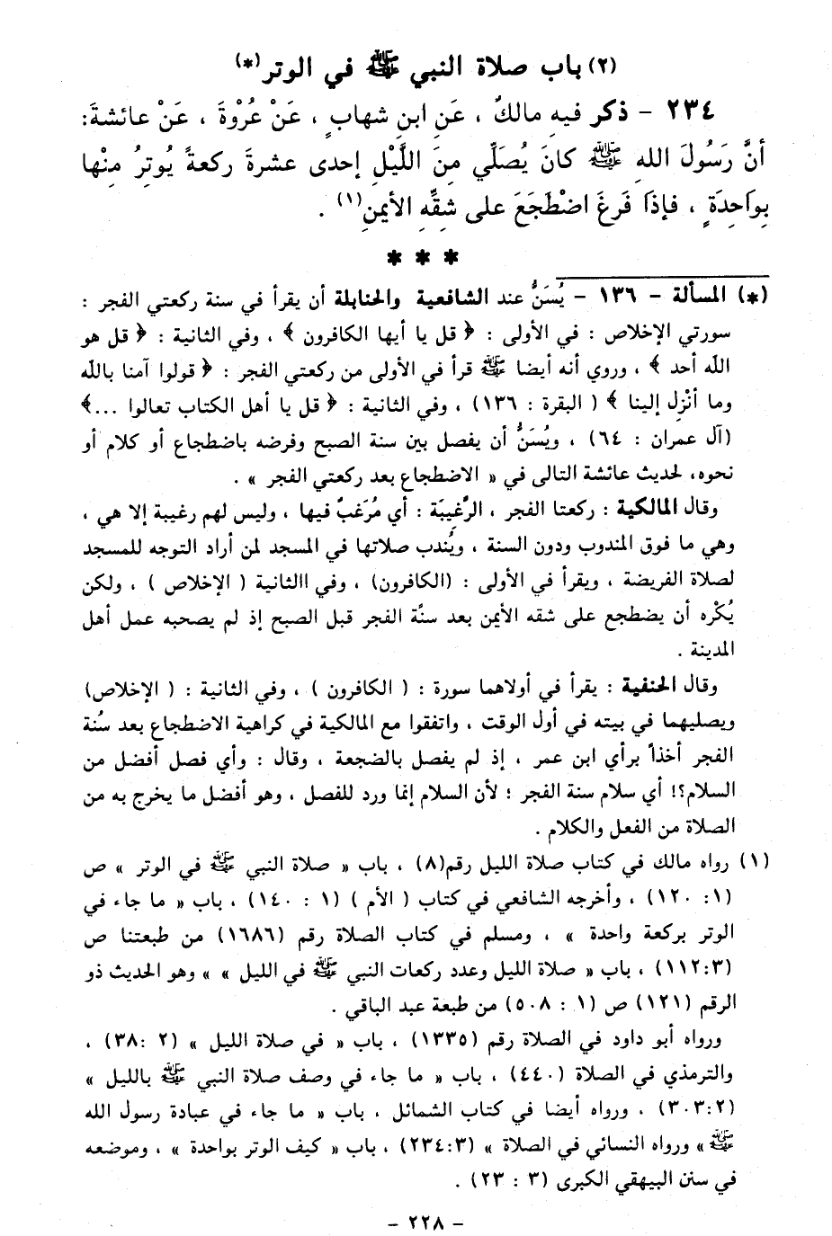 234 - ذَكَرَ فِيهِ مَالِكٌ عَنِ ابْنِ شِهَابٍ، عَنْ عُرْوَةَ، عَنْ عَائِشَةَأَنَّ رَسُولَ اللَّهِ - صَلَّى اللَّهُ عَلَيْهِ وَسَلَّمَ - كَانَ يُصَلِّي مِنَ اللَّيْلِ إِحْدَى عَشْرَةَ رَكْعَةً، يُوتِرُ مِنْهَا بِوَاحِدَةٍ، فَإِذَا فَرَغَ اضْطَجَعَ عَلَى شِقِّهِ الْأَيْمَنِ.