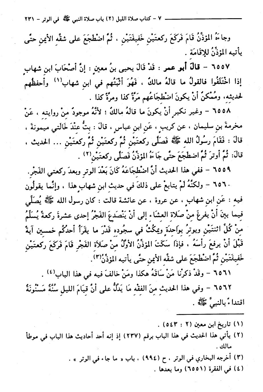 6558 - وَغَيْرُ نَكِيرٍ أَنْ يَكُونَ مَا قَالَهُ مَالِكٌ ; لِأَنَّهُ مَوْجُودٌ مِنْ رِوَايَتِهِ، عَنْ مَخْرَمَةَ بْنِ سُلَيْمَانَ، عَنْ كُرَيْبٍ، عَنِ ابْنِ عَبَّاسٍ، قَالَ:بِتُّ عِنْدَ خَالَتِي مَيْمُونَةَ، قَالَ: فَقَامَ رَسُولُ اللَّهِ - صَلَّى اللَّهُ عَلَيْهِ وَسَلَّمَ - فَصَلَّى رَكْعَتَيْنِ، ثُمَّ رَكْعَتَيْنِ، ثُمَّ رَكْعَتَيْنِ... الْحَدِيثَ، قَالَ: ثُمَّ أَوْتَرَ، ثُمَّ اضْطَجَعَ حَتَّى جَاءَهُ الْمُؤَذِّنُ فَصَلَّى رَكْعَتَيْنِ.
