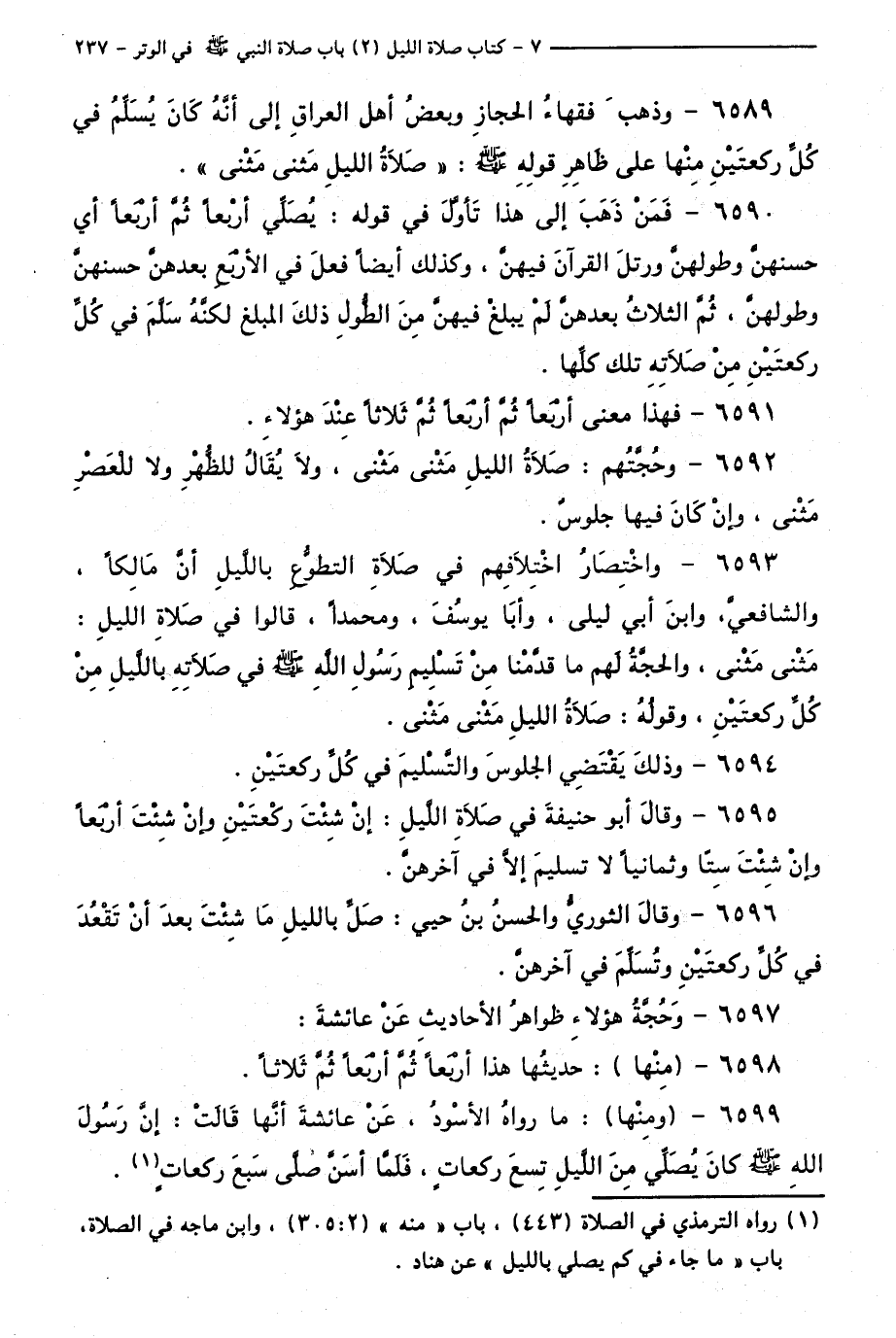 6589 - وَذَهَبَ فُقَهَاءُ الْحِجَازِ وَبَعْضُ أَهْلِ الْعِرَاقِ إِلَى أَنَّهُ كَانَ يُسَلِّمُ فِي كُلِّ رَكْعَتَيْنِ مِنْهَا، عَلَى ظَاهِرِ قَوْلِهِ: " صَلَاةُ اللَّيْلِ مَثْنَى مَثْنَى ".