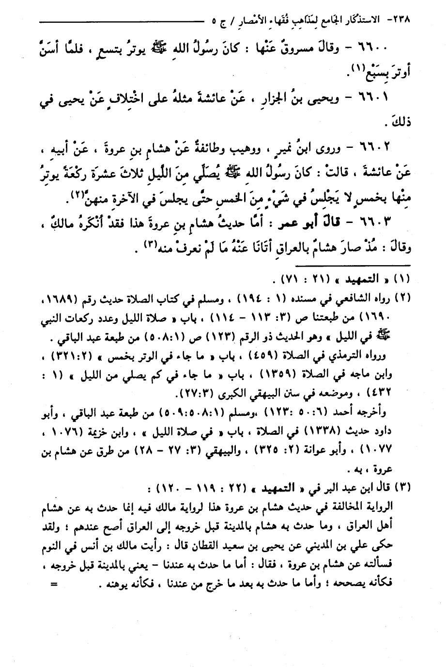 6602 - وَرَوَى ابْنُ نُمَيْرٍ، وَوُهَيْبٍ وَطَائِفَةٌ عَنْ هِشَامِ بْنِ عُرْوَةَ، عَنْ أَبِيهِ، عَنْ عَائِشَةَ، قَالَتْ:كَانَ رَسُولُ اللَّهِ - صَلَّى اللَّهُ عَلَيْهِ وَسَلَّمَ - يُصَلِّي مِنَ اللَّيْلِ ثَلَاثَ عَشْرَةَ رَكْعَةً، يُوتِرُ مِنْهَا بِخَمْسٍ لَا يَجْلِسُ فِي شَيْءٍ مِنَ الْخَمْسِ حَتَّى يَجْلِسَ فِي الْآخِرَةِ مِنْهُنَّ.