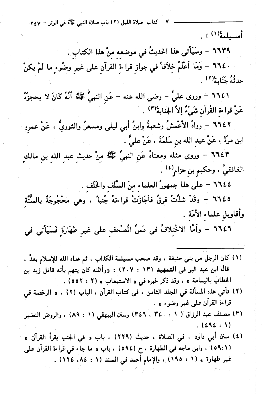 6645 - وَقَدْ شَذَّتْ فِرَقٌ فَأَجَازَتْ قِرَاءَتَهُ جُنُبًا وَهِيَ مَحْجُوجَةٌ بِالسُّنَّةِ وَأَقَاوِيلِ عُلَمَاءِ الْأُمَّةِ.