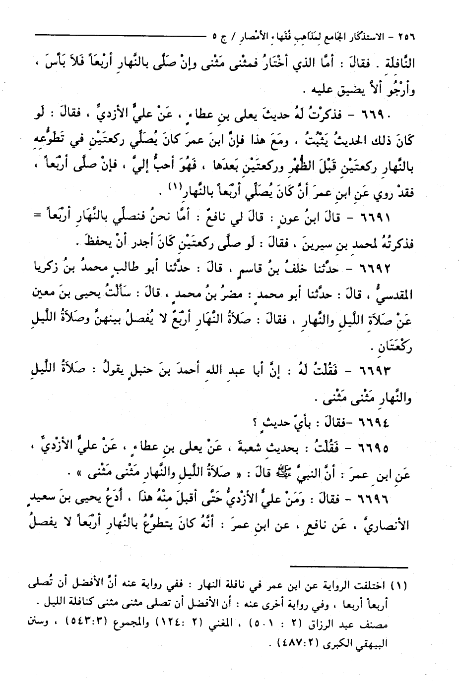 6696 - فَقَالَ: وَمَنْ عَلِيٌّ الْأَزْدِيُّ حَتَّى أَقْبَلَ مِنْهُ هَذَا ؟ ! أَدَعُ يَحْيَى بْنَ سَعِيدٍ الْأَنْصَارِيَّ، عَنْ نَافِعٍ، عَنِ ابْنِ عُمَرَ: أَنَّهُ كَانَ يَتَطَوَّعُ بِالنَّهَارِ أَرْبَعًا لَا يَفْصِلُ
