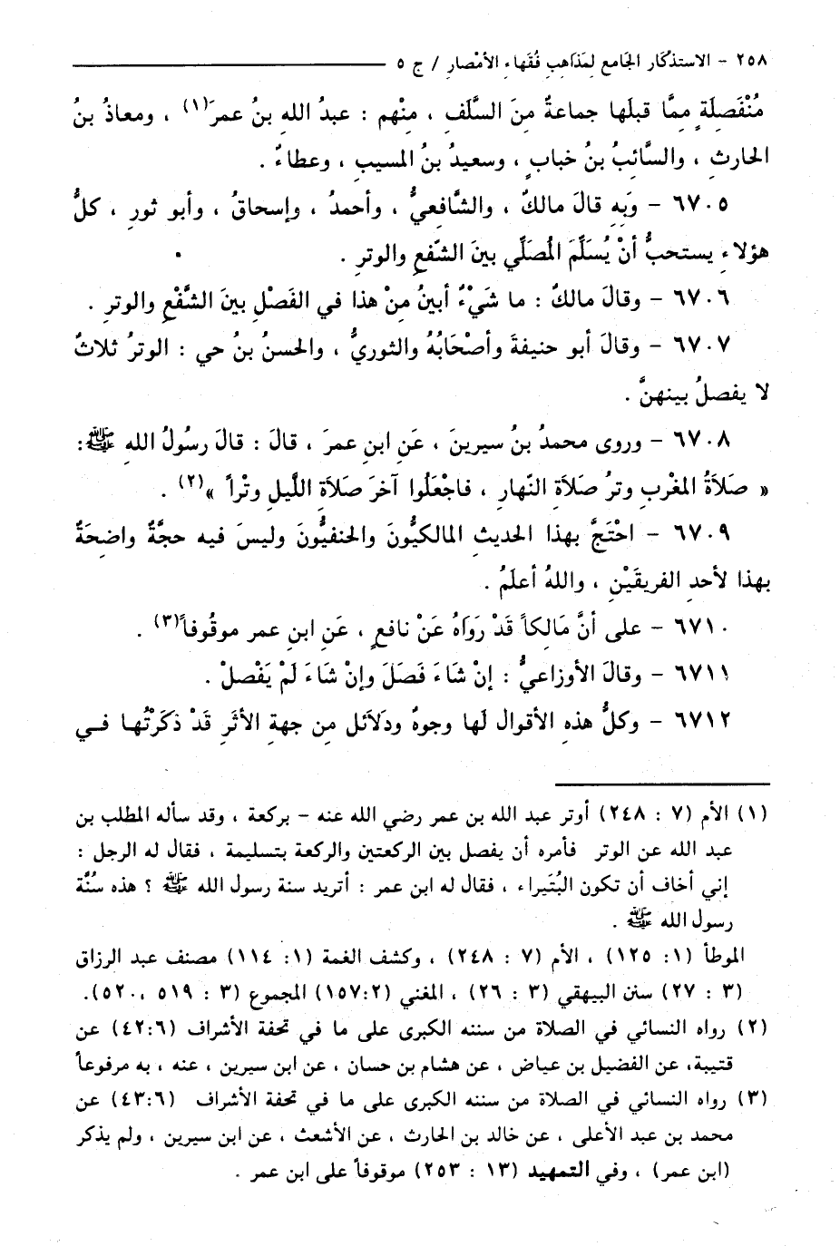 6708 - وَرَوَى مُحَمَّدُ بْنُ سِيرِينَ، عَنِ ابْنِ عُمَرَ، قَالَ: قَالَ رَسُولُ اللَّهِ - صَلَّى اللَّهُ عَلَيْهِ وَسَلَّمَ -: "صَلَاةُ الْمَغْرِبِ وِتْرُ صَلَاةِ النَّهَارِ، فَاجْعَلُوا آخِرَ صَلَاةِ اللَّيْلِ وِتْرًا.