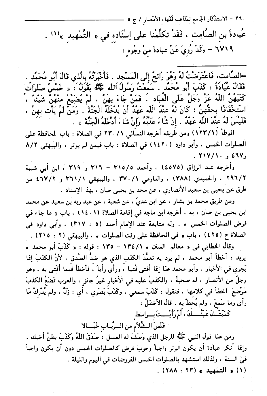 عُبَادَةَ بْنِ الصَّامِتِ، فَقَدْ تَكَلَّمْنَا عَلَى إِسْنَادِهِ فِي " التَّمْهِيدِ ".