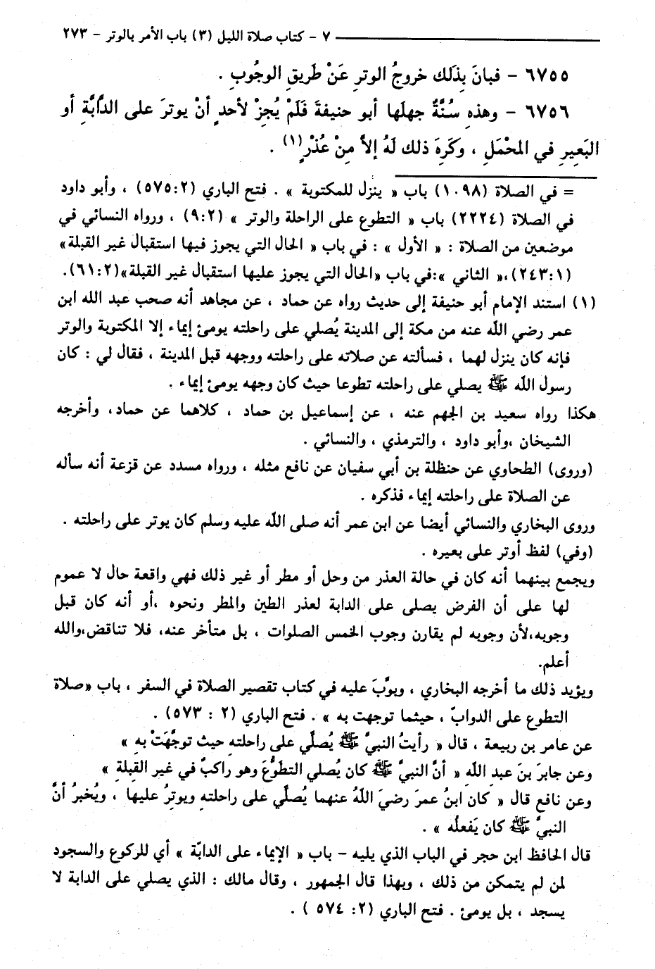 6756 - وَهَذَا سُنَّةٌ جَهِلَهَا أَبُو حَنِيفَةَ فَلَمْ يُجِزْ لِأَحَدٍ أَنْ يُوتِرَ عَلَى الدَّابَّةِ أَوِ الْبَعِيرِ فِي الْمَحْمَلِ، وَكَرِهَ ذَلِكَ لَهُ إِلَّا مِنْ عُذْرٍ.