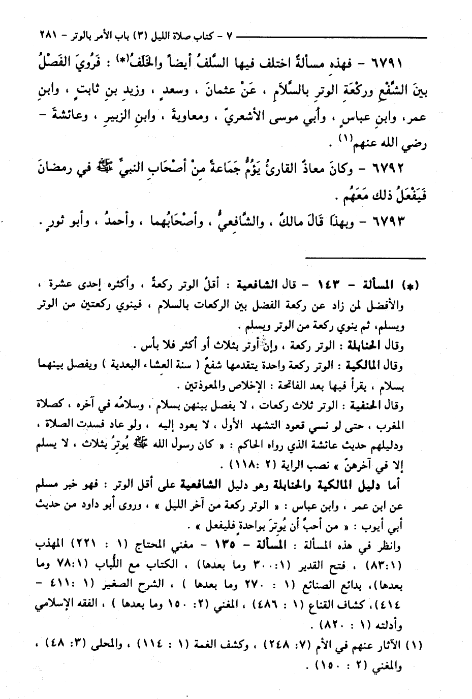 6791 - فَهَذِهِ مَسْأَلَةٌ اخْتَلَفَ فِيهَا السَّلَفُ أَيْضًا وَالْخَلَفُ: فَرُوِيَ الْفَصْلُ بَيْنَ الشَّفْعِ وَرَكْعَةِ الْوِتْرِ بِالسَّلَامِ، عَنْ عُثْمَانَ، وَسَعْدٍ، وَزَيْدِ بْنِ ثَابِتٍ، وَابْنِ عُمَرَ، وَابْنِ عَبَّاسٍ، وَأَبِي مُوسَى الْأَشْعَرِيِّ، وَمُعَاوِيَةَ، وَابْنِ الزُّبَيْرِ، وَعَائِشَةَ رَضِيَ اللَّهُ عَنْهُمْ.
