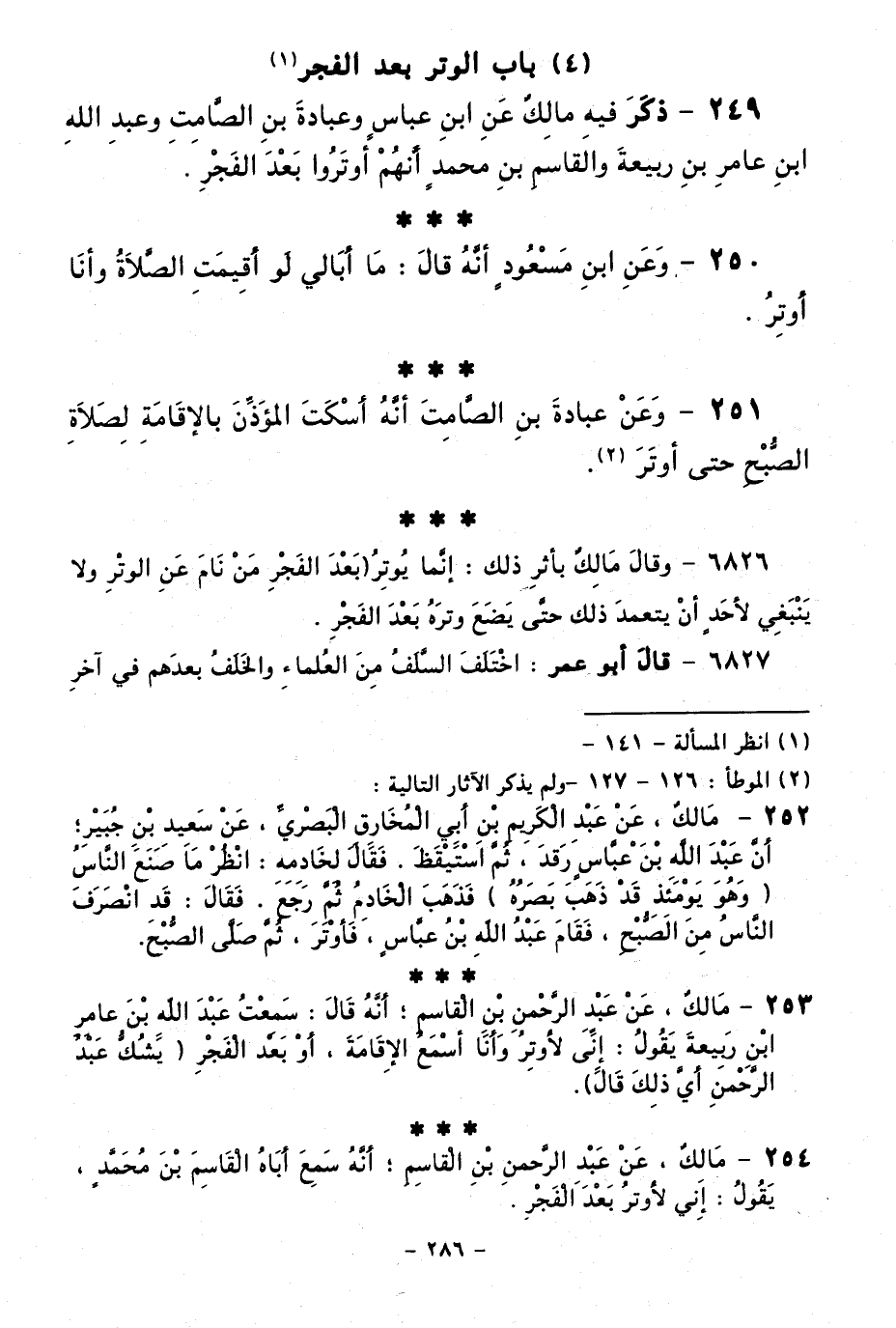 249 - ذَكَرَ فِيهِ مَالِكٌ عَنِ ابْنِ عَبَّاسٍ، وَعُبَادَةَ بْنِ الصَّامِتِ، وَعَبْدِ اللَّهِ بْنِ عَامِرِ بْنِ رَبِيعَةَ، وَالْقَاسِمِ بْنِ مُحَمَّدٍ أَنَّهُمْ أَوْتَرُوا بَعْدَ الْفَجْرِ.