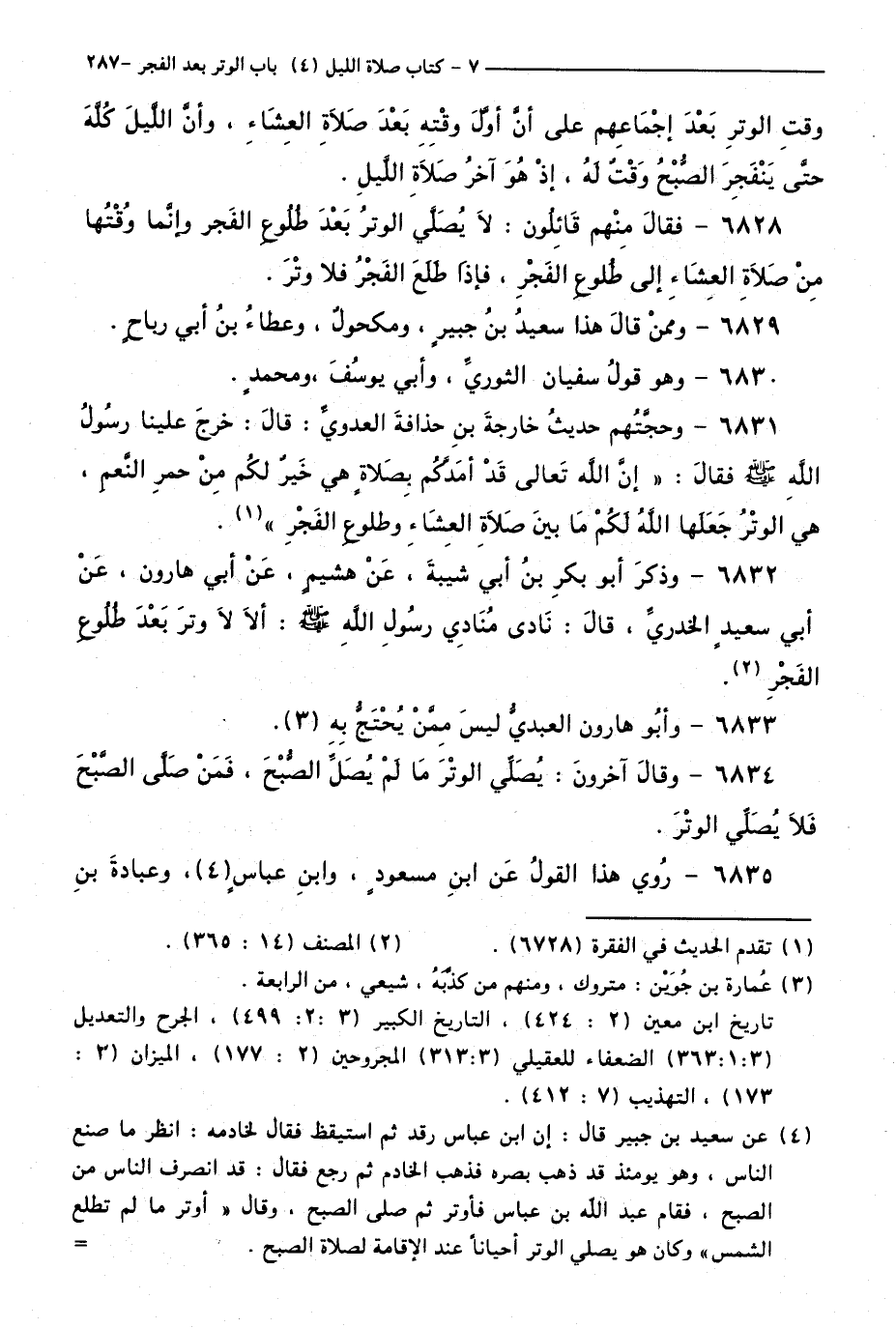 6832 - وَذَكَرَ أَبُو بَكْرِ بْنُ أَبِي شَيْبَةَ عَنْ هُشَيْمٍ، عَنْ أَبِي هَارُونَ، عَنْ أَبِي سَعِيدٍ الْخُدْرِيِّ، قَالَ: نَادَى مُنَادِي رَسُولِ اللَّهِ - صَلَّى اللَّهُ عَلَيْهِ وَسَلَّمَ -:أَلَا لَا وِتْرَ بَعْدَ طُلُوعِ الْفَجْرِ.