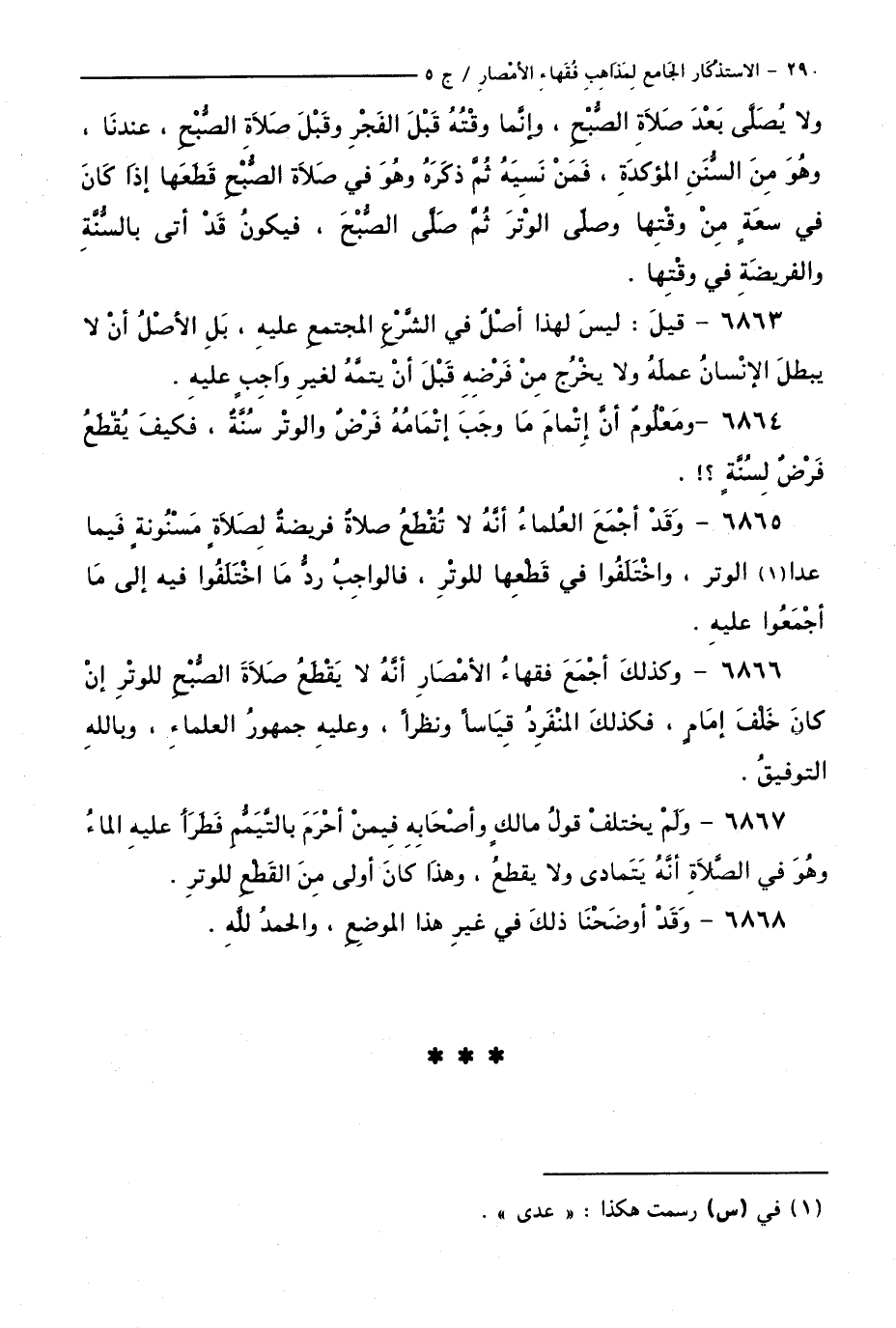 6866 - وَكَذَلِكَ أَجْمَعَ فُقَهَاءُ الْأَمْصَارِ أَنَّهُ لَا يَقْطَعُ صَلَاةَ الصُّبْحِ لِلْوِتْرِ إِنْ كَانَ خَلْفَ إِمَامٍ، فَكَذَلِكَ الْمُنْفَرِدُ قِيَاسًا وَنَظَرًا وَعَلَيْهِ جُمْهُورُ الْعُلَمَاءِ، وَبِاللَّهِ التَّوْفِيقُ.