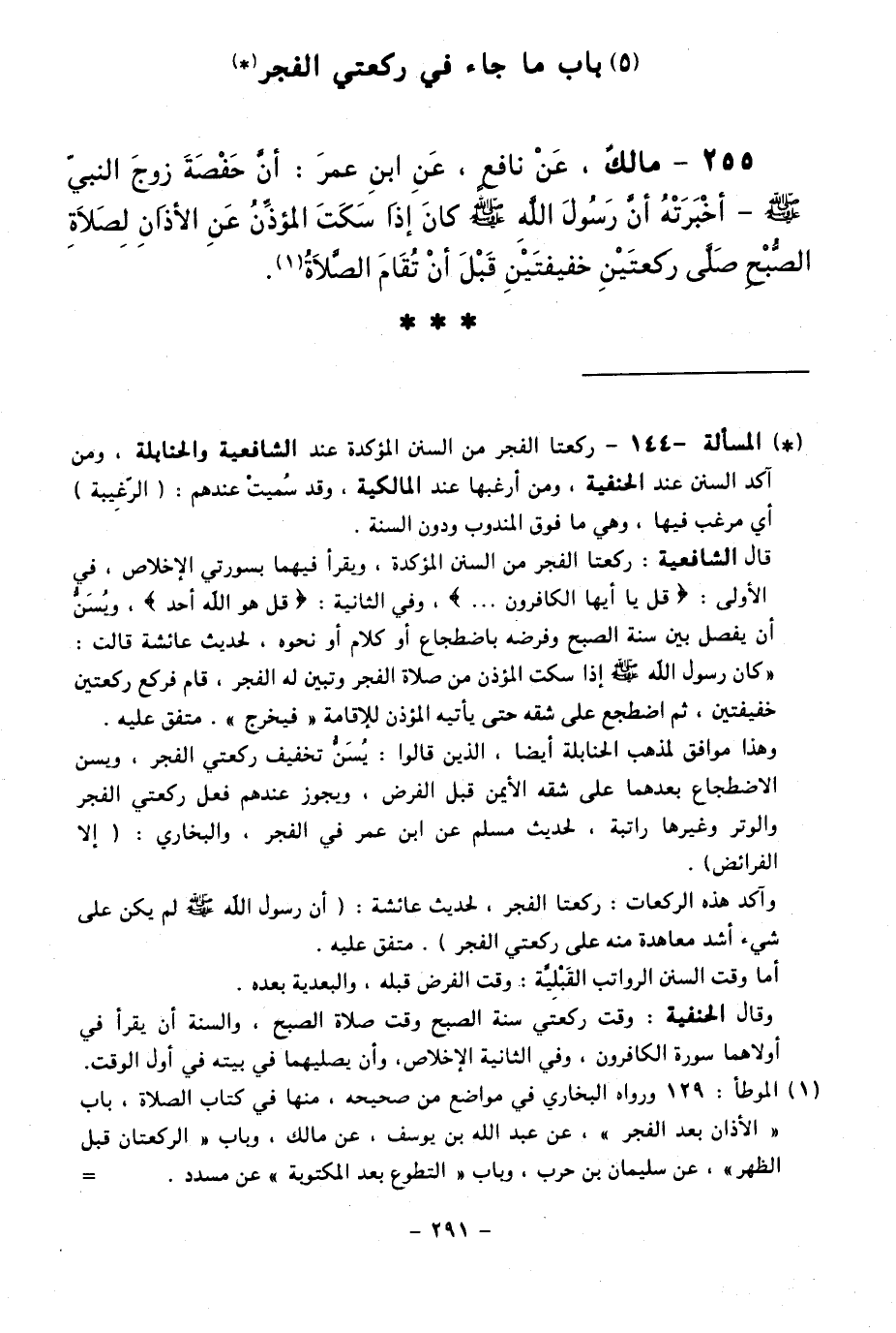 255 - مَالِكٌ، عَنْ نَافِعٍ، عَنِ ابْنِ عُمَرَ أَنَّ حَفْصَةَ زَوْجَ النَّبِيِّ أَخْبَرَتْهُأَنَّ رَسُولَ اللَّهِ - صَلَّى اللَّهُ عَلَيْهِ وَسَلَّمَ - كَانَ إِذَا سَكَتَ الْمُؤَذِّنُ عَنِ الْأَذَانِ لِصَلَاةِ الصُّبْحِ صَلَّى رَكْعَتَيْنِ خَفِيفَتَيْنِ قَبْلَ أَنْ تُقَامَ الصَّلَاةُ.