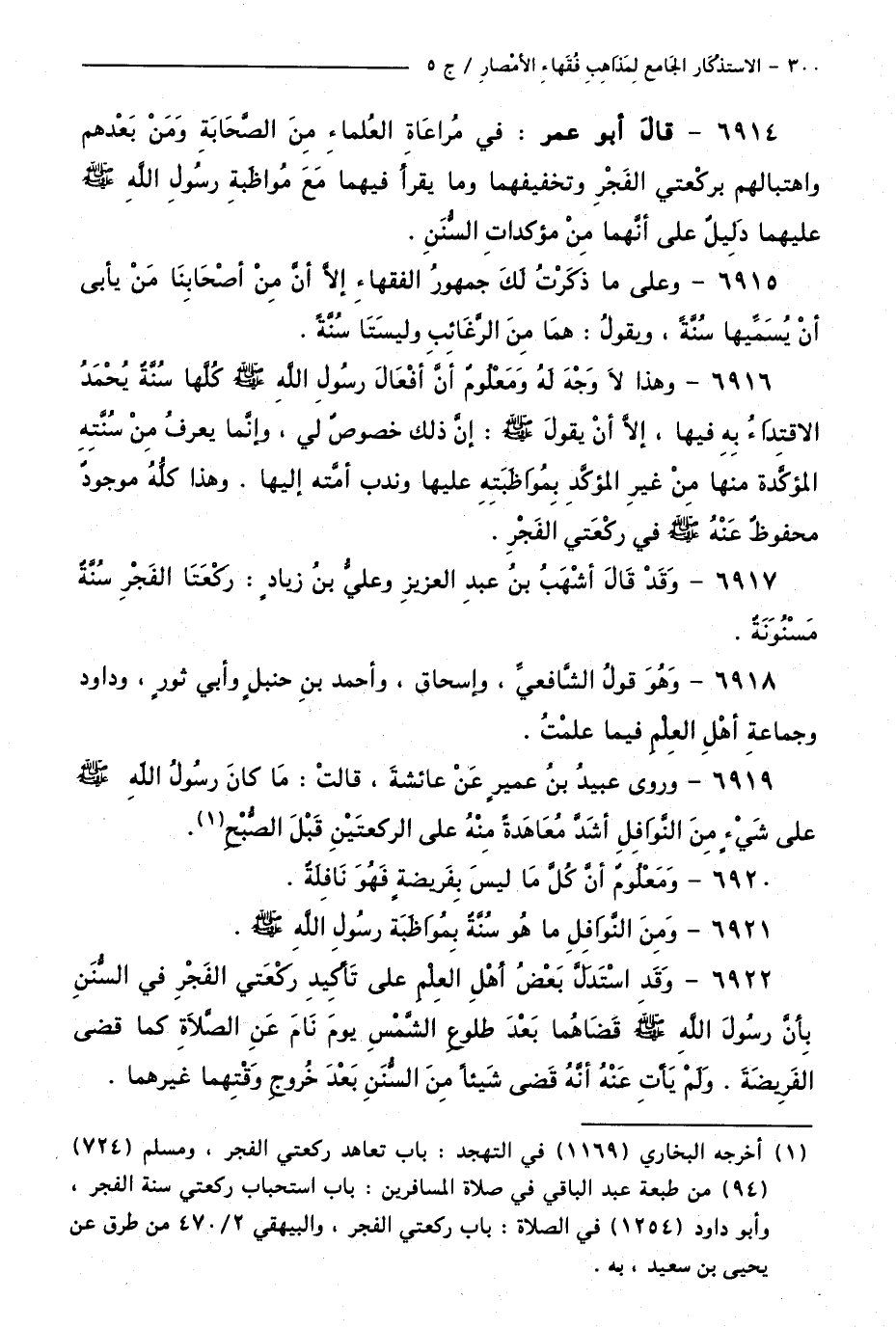 6914 - قَالَ أَبُو عُمَرَ: فِي مُرَاعَاةِ الْعُلَمَاءِ مِنَ الصَّحَابَةِ وَمَنْ بَعْدَهُمْ، وَاهْتِبَالِهِمْ بِرَكْعَتَيِ الْفَجْرِ وَتَخْفِيفِهِمَا، وَمَا يُقْرَأُ فِيهِمَا مَعَ مُوَاظَبَةِ رَسُولِ اللَّهِ - صَلَّى اللَّهُ عَلَيْهِ وَسَلَّمَ - عَلَيْهِمَا، دَلِيلٌ عَلَى أَنَّهُمَا مِنْ مُؤَكَّدَاتِ السُّنَنِ.