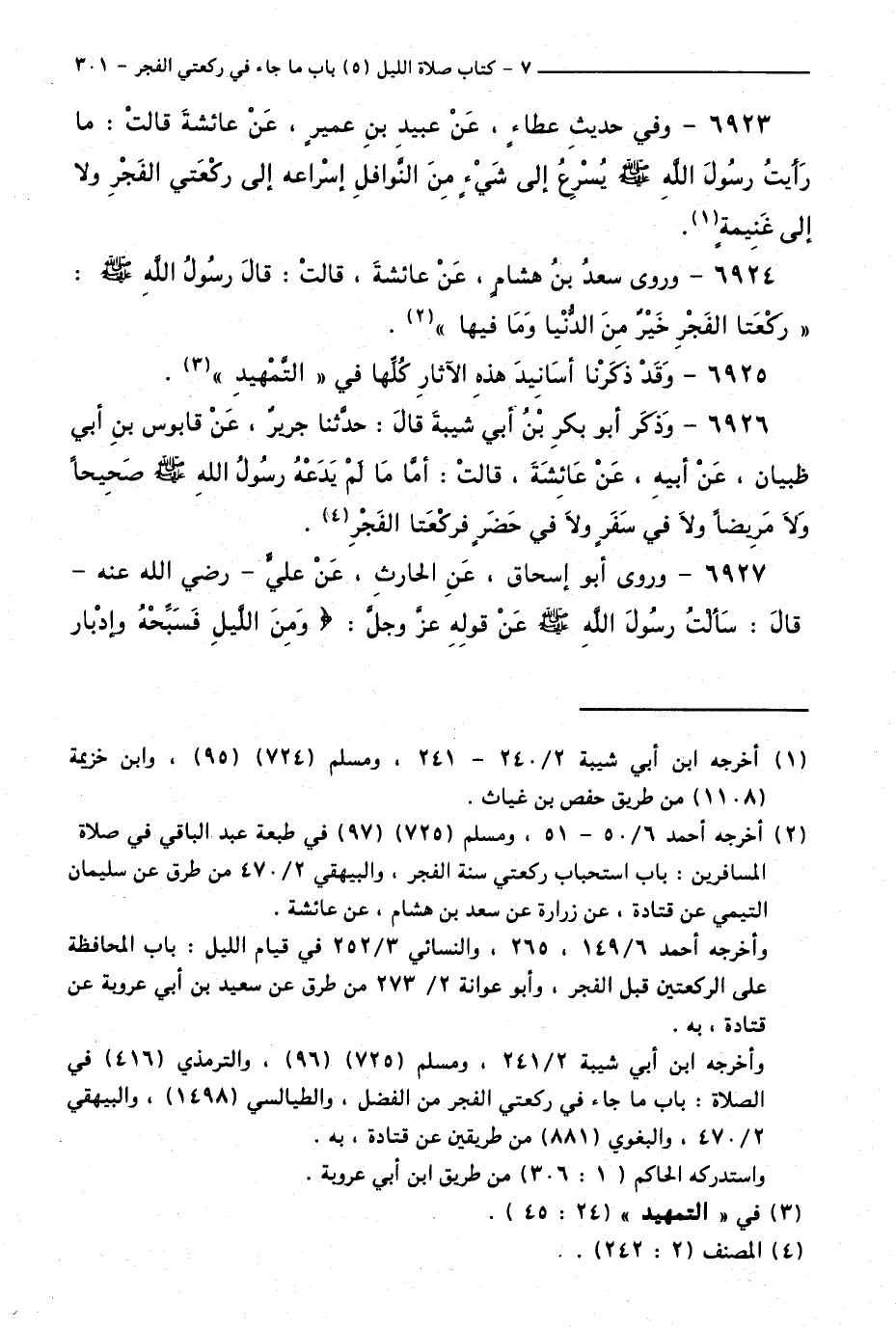 6923 - وَفِي حَدِيثِ عَطَاءٍ، عَنْ عُبَيْدِ بْنِ عُمَيْرٍ،عَنْ عَائِشَةَ قَالَتْ: مَا رَأَيْتُ رَسُولَ اللَّهِ - صَلَّى اللَّهُ عَلَيْهِ وَسَلَّمَ - يُسْرِعُ إِلَى شَيْءٍ مِنَ النَّوَافِلِ إِسْرَاعَهُ إِلَى رَكْعَتَيِ الْفَجْرِ وَلَا إِلَى غَنِيمَةٍ.