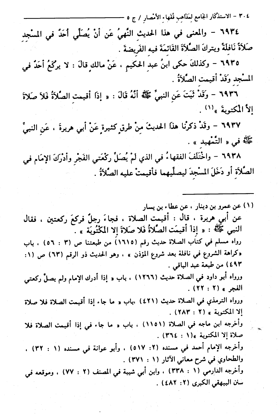 6935 - وَكَذَلِكَ حَكَى ابْنُ عَبْدِ الْحَكِيمِ، عَنْ مَالِكٍ قَالَ: لَا يَرْكَعُ أَحَدٌ فِي الْمَسْجِدِ وَقَدْ أُقِيمَتِ الصَّلَاةُ.