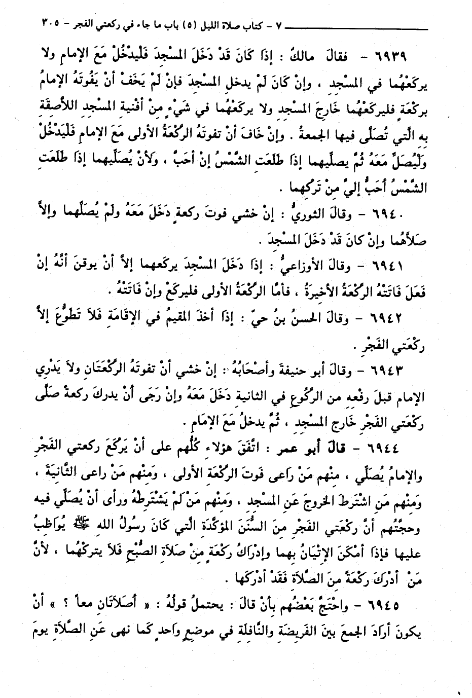 6944 - قَالَ أَبُو عُمَرَ: اتَّفَقَ هَؤُلَاءِ كُلُّهُمْ عَلَى أَنْ يَرْكَعَ رَكْعَتَيِ الْفَجْرِ وَالْإِمَامُ يُصَلِّي، مِنْهُمْ مَنْ رَاعَى فَوْتَ الرَّكْعَةِ الْأُولَى، وَمِنْهُمْ مَنْ رَاعَى الثَّانِيَةَ، وَمِنْهُمْ مَنِ اشْتَرَطَ الْخُرُوجَ عَنِ الْمَسْجِدِ، وَمِنْهُمْ مَنْ لَمْ يَشْتَرِطْهُ وَرَأَى أَنْ يُصَلِّيَ فِيهِ وَحُجَّتُهُمْ أَنَّ رَكْعَتَيِ الْفَجْرِ مِنَ السُّنَنِ الْمُؤَكَّدَةِ الَّتِي كَانَ رَسُولُ اللَّهِ - صَلَّى اللَّهُ عَلَيْهِ وَسَلَّمَ - يُوَاظِبُ عَلَيْهَا، فَإِذَا أَمْكَنَ الْإِتْيَانُ بِهِمَا وَإِدْرَاكُ رَكْعَةٍ مِنْ صَلَاةِ الصُّبْحِ فَلَا يَتْرُكُهُمَا، لِأَنَّ مَنْ أَدْرَكَ رَكْعَةً مِنَ الصَّلَاةِ فَقَدْ أَدْرَكَهَا.