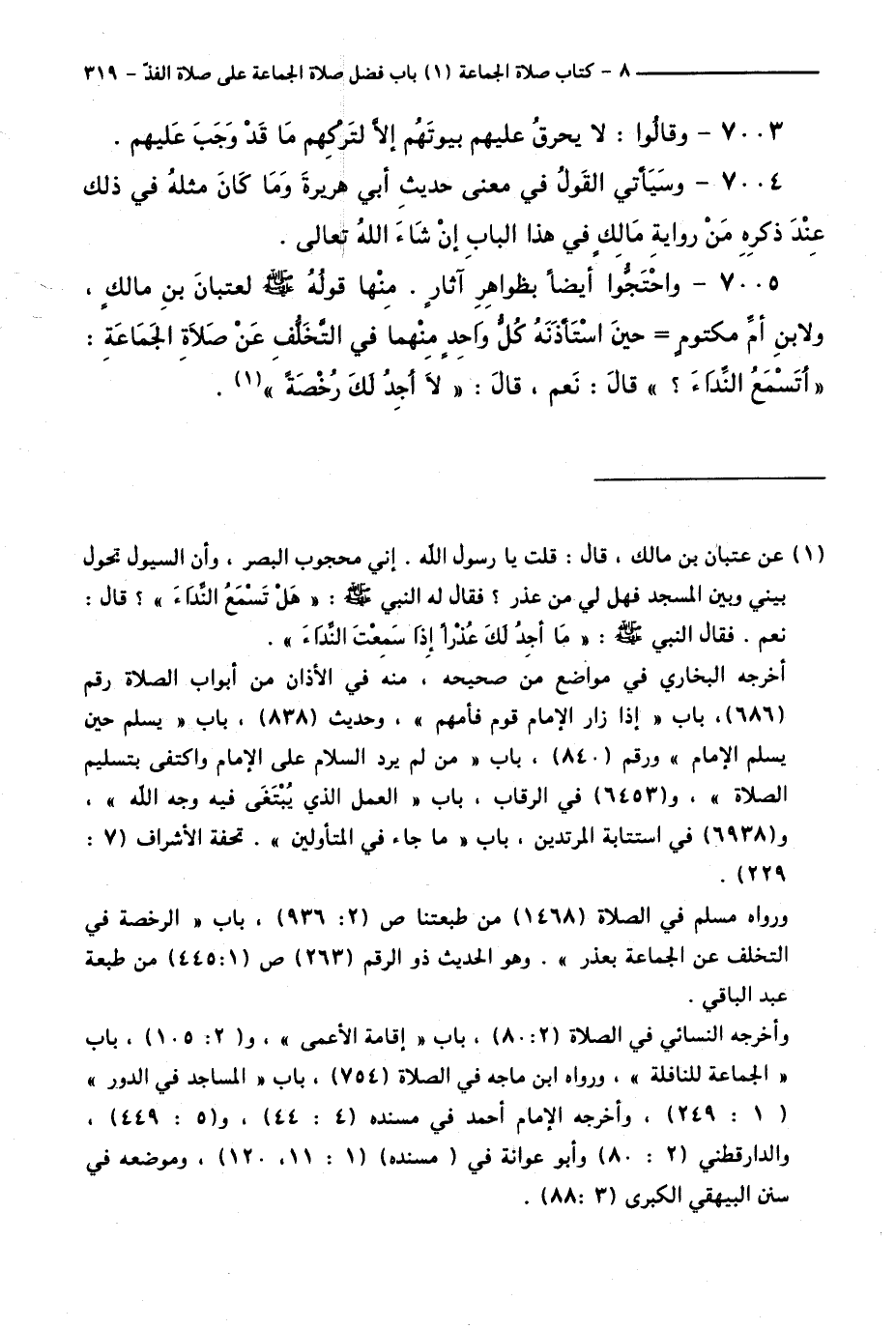 7005 - وَاحْتَجُّوا أَيْضًا بِظَوَاهِرِ آثَارٍ. مِنْهَا قَوْلُهُ - صَلَّى اللَّهُ عَلَيْهِ وَسَلَّمَ - لَعَتْبَانَ بْنِ مَالِكٍ وَلِابْنِ أُمِّ مَكْتُومٍ حِينَ اسْتَأْذَنَهُ كُلُّ وَاحِدٍ مِنْهُمَا فِي التَّخَلُّفِ عَنْ صَلَاةِ الْجَمَاعَةِ: "أَتَسْمَعُ النِّدَاءَ ؟ " قَالَ: نَعَمْ. قَالَ: " لَا أَجِدُ لَكَ رُخْصَةً ".