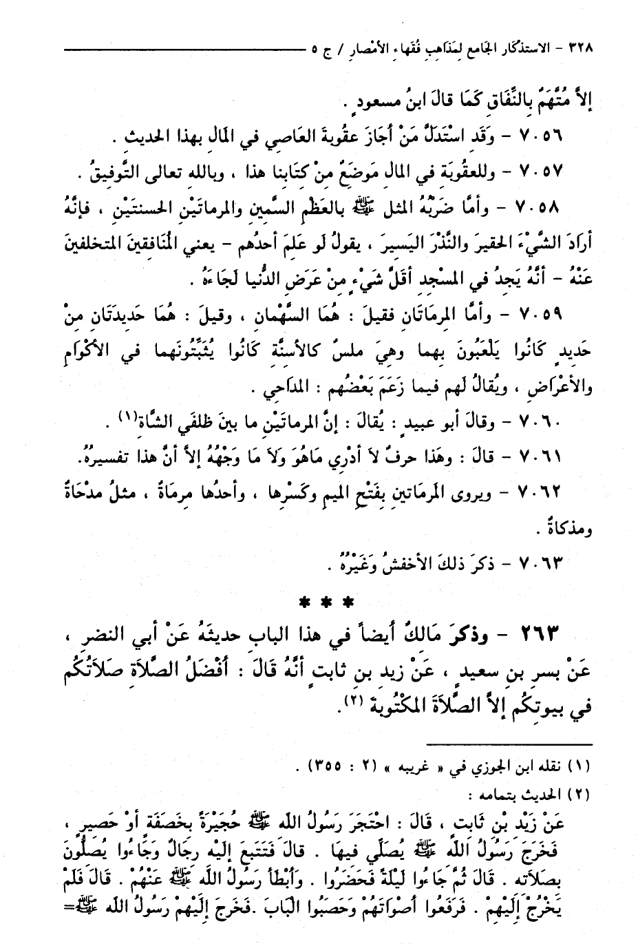 263 - وَذَكَرَ مَالِكٌ أَيْضًا فِي هَذَا الْبَابِ حَدِيثَهُ عَنْ أَبِي النَّضْرِ، عَنْ بُسْرِ بْنِ سَعِيدٍ، عَنْ زَيْدِ بْنِ ثَابِتٍ، أَنَّهُ قَالَ: أَفْضَلُ الصَّلَاةِ صَلَاتُكُمْ فِي بُيُوتِكُمْ إِلَّا الصَّلَاةَ الْمَكْتُوبَةَ.