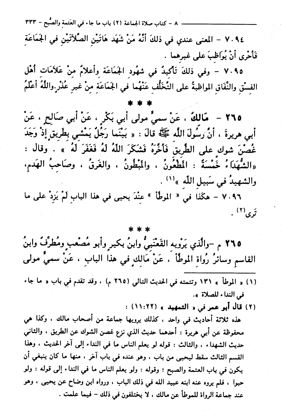 265 - مَالِكٌ، عَنْ سُمَيٍّ مَوْلَى أَبِي بَكْرٍ، عَنْ أَبِي صَالِحٍ، عَنْ أَبِي هُرَيْرَةَ أَنَّ رَسُولَ اللَّهِ - صَلَّى اللَّهُ عَلَيْهِ وَسَلَّمَ - قَالَ: "بَيْنَمَا رَجُلٌ يَمْشِي بِطَرِيقٍ إِذْ وَجَدَ غُصْنَ شَوْكٍ عَلَى الطَّرِيقِ فَأَخَّرَهُ فَشَكَرَ اللَّهُ لَهُ فَغَفَرَ لَهُ ". وَقَالَ: " الشُّهَدَاءُ خَمْسَةٌ: الْمَطْعُونُ، وَالْمَبْطُونُ، وَالْغَرِقُ، وَصَاحِبُ الْهَدْمِ، وَالشَّهِيدُ فِي سَبِيلِ اللَّهِ ".