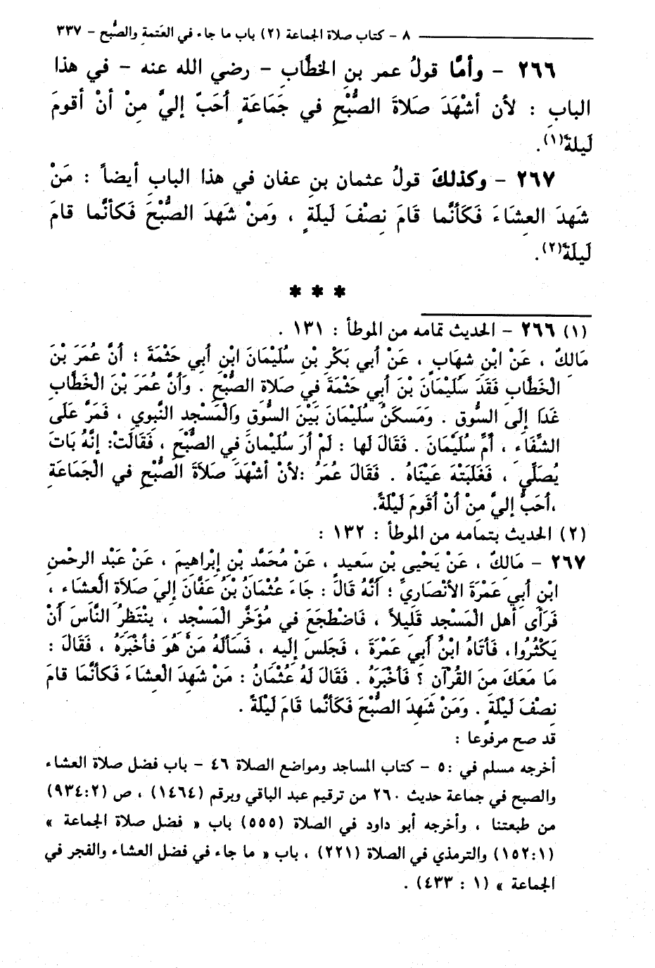 267 - وَكَذَلِكَ قَوْلُ عُثْمَانَ بْنِ عَفَّانَ فِي هَذَا الْبَابِ أَيْضًا: مَنْ شَهِدَ الْعِشَاءَ فَكَأَنَّمَا قَامَ نِصْفَ لَيْلَةٍ، وَمَنْ شَهِدَ الصُّبْحَ فَكَأَنَّمَا قَامَ لَيْلَةً.